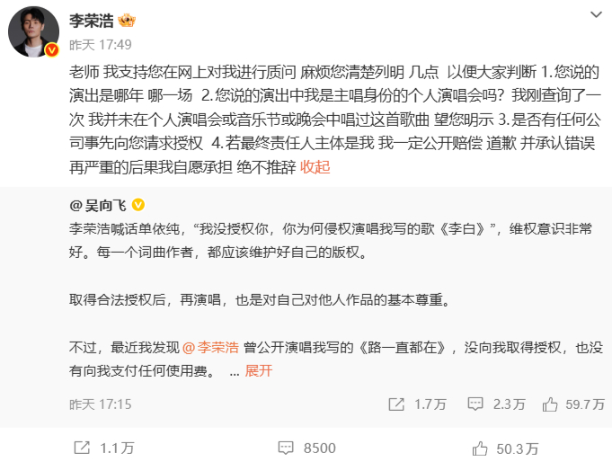 但李荣浩不一样,他没授权单依纯在演唱会上唱《李白》,结果人家还是翻唱了。他要维权,公开声讨,然后被骂。