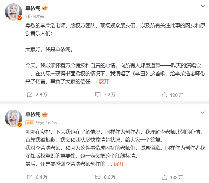 本日凌晨,单依纯在其个人社媒发长文道歉,她称此次巡演的曲目版权审核、授权申请等工作,均由主办公司全权负责,自己演出前未进一步核实授权文件细节,之后才得知主办方实际并未签署《李白》的表演授权。