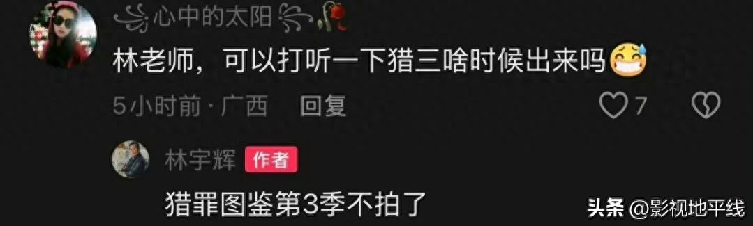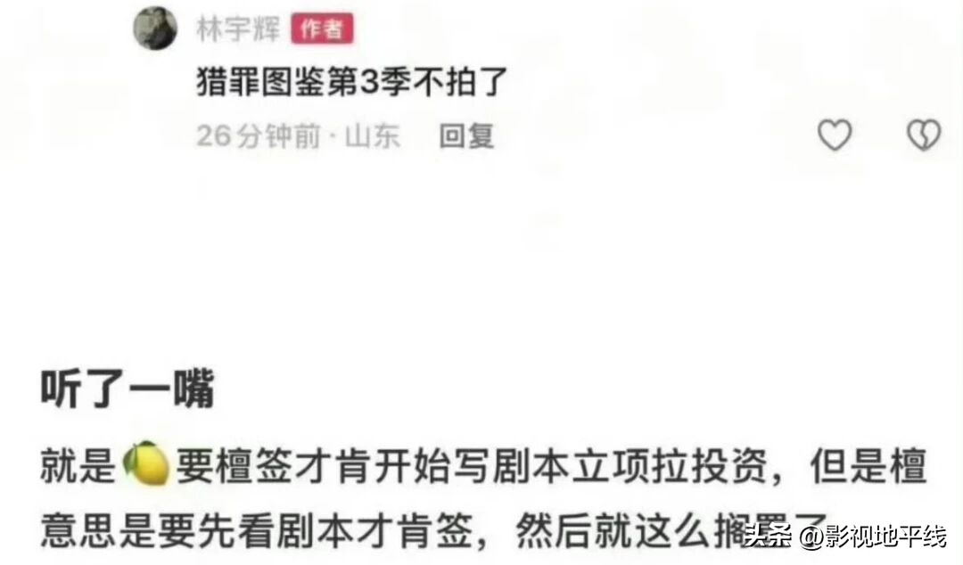有网友在评论区询问剧集第三季的拍摄进展,曾作为剧中主角沈翊原型人物的刑侦模拟画像专家林宇辉,直接回复称“猎罪图鉴第3季不拍了”。