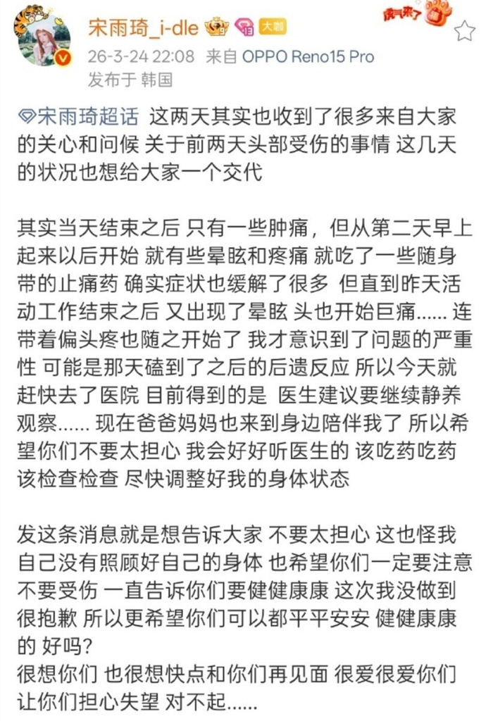 2026年3月,她在(G)I-DLE曼谷巡演的舞台上,意外头部撞击升降台,起初仅以为是普通磕碰,服用止痛药硬撑完成表演,没想到后续出现了持续性眩晕、剧烈偏头痛等症状,就医后被诊断为脑震荡后遗症。