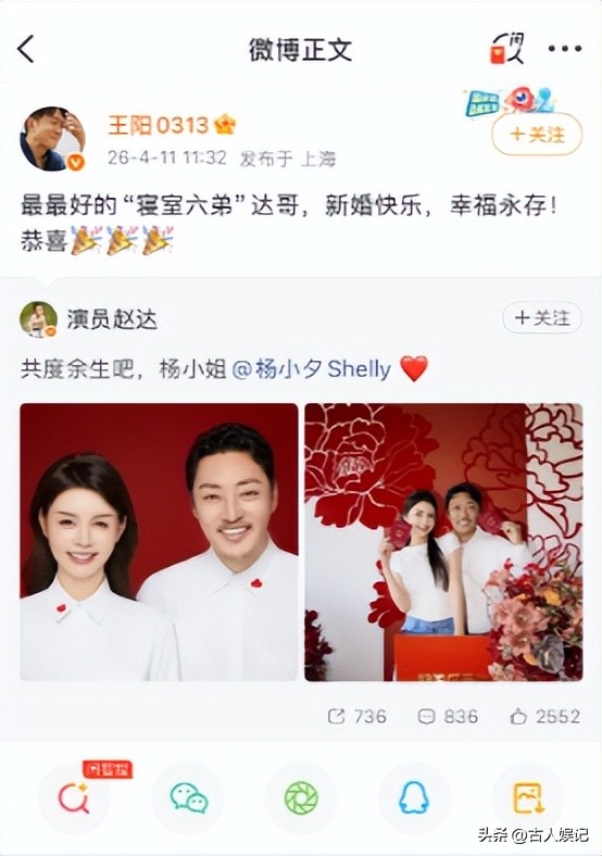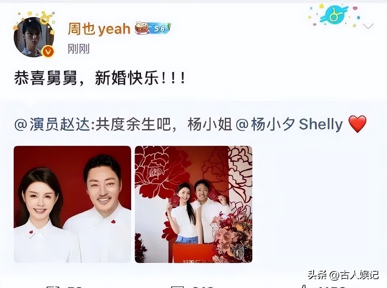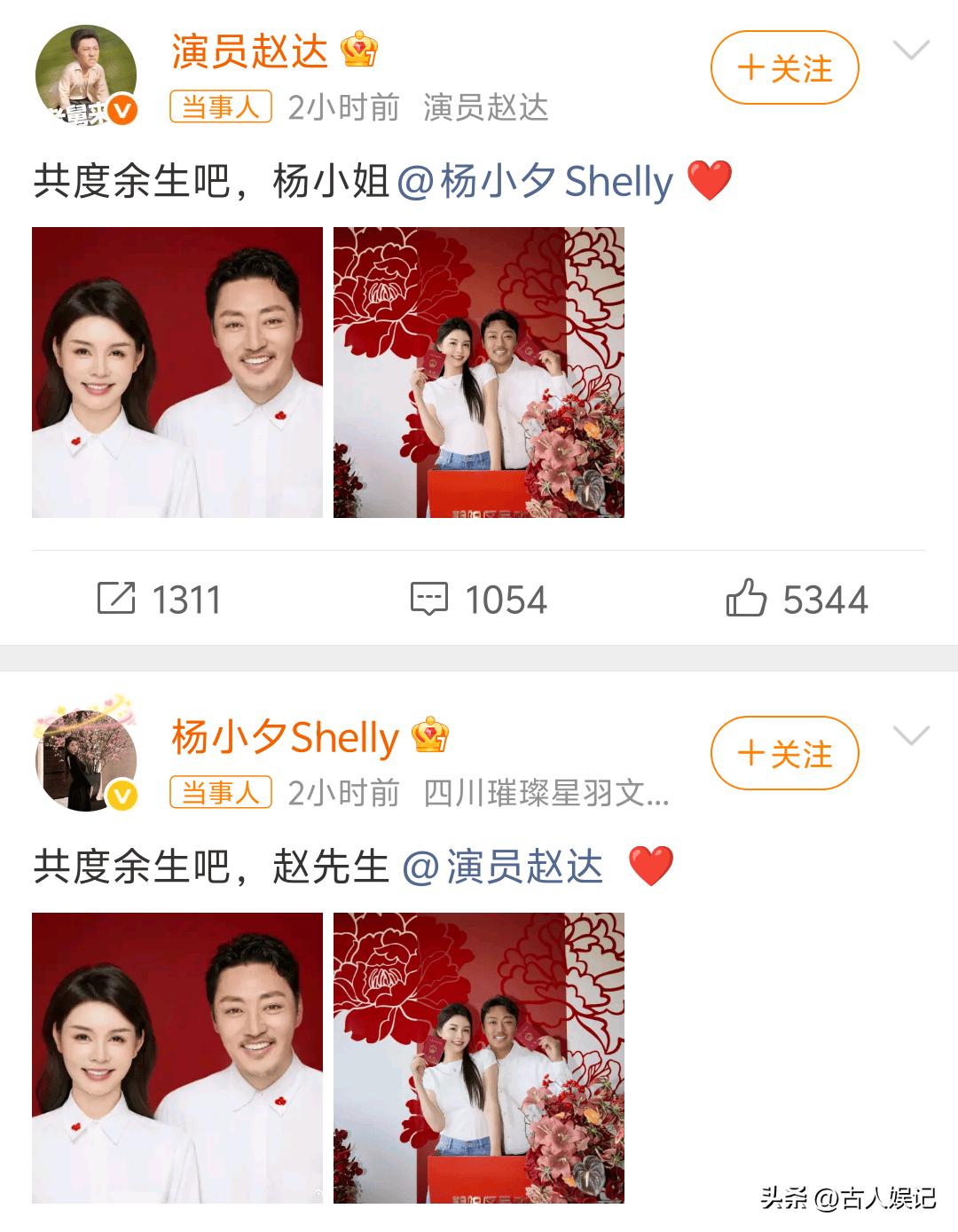 2026年4月11日,演员赵达在社交媒体上甩出一张红底结婚证照片,配文只有一句话:“共度余生吧,杨小姐。”