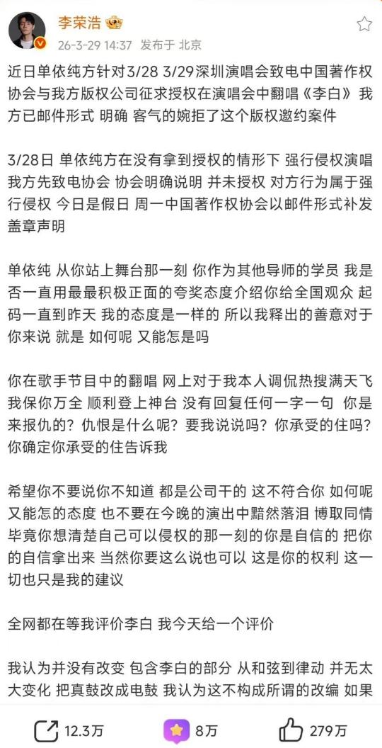 按理说,单依纯好好和李荣浩道个歉、再不济赔点钱以后不唱了,对方也不是什么难缠的人。