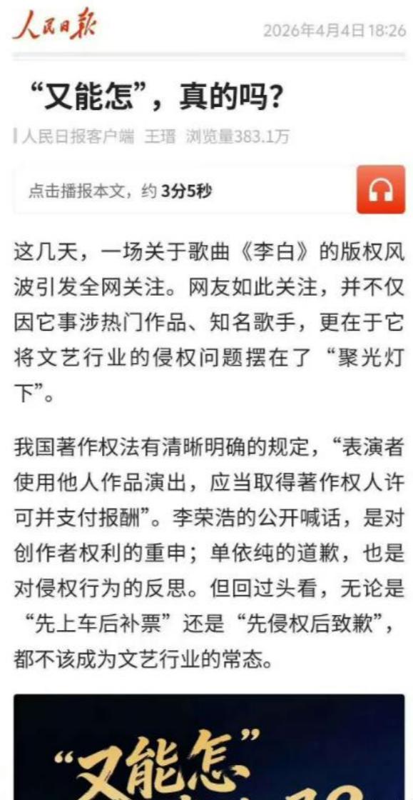 官媒的意思无非是说,版权不是“人情债”,不是“先上车后补票”的潜规则,是底线,是红线,谁碰谁翻车。