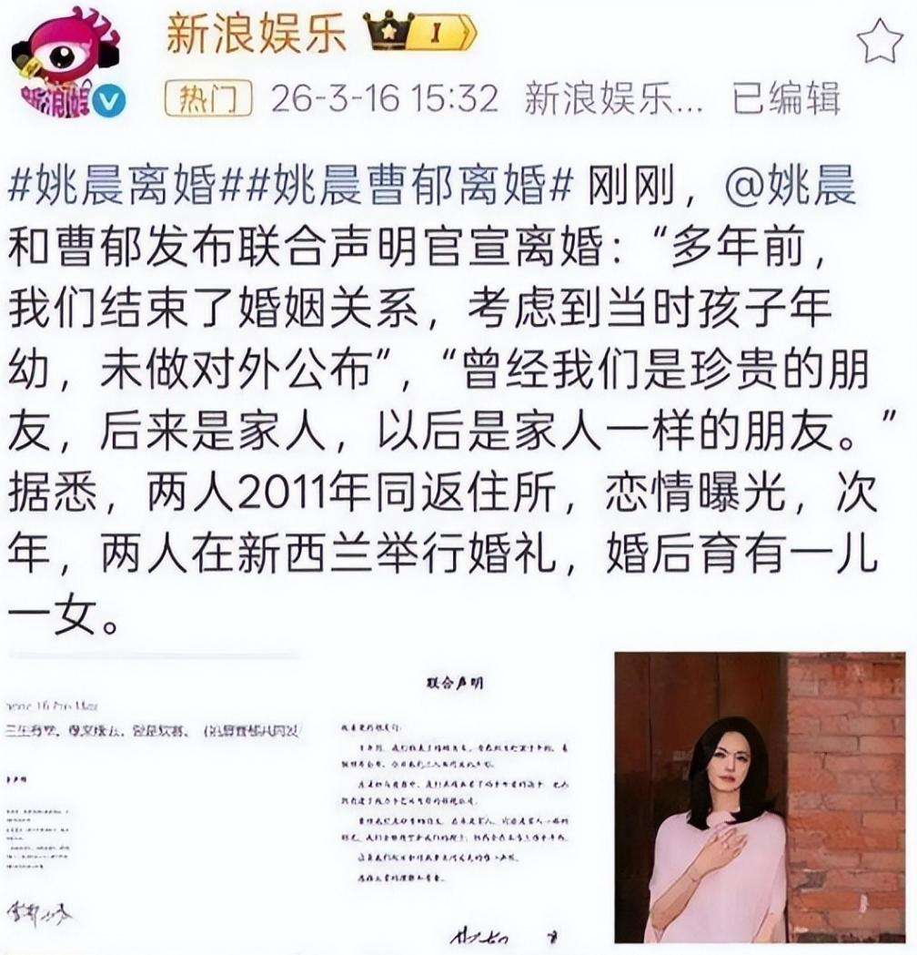前不久,姚晨和曹郁发了离婚声明,说是俩人早就离婚了,因为孩子太小所以迟迟没有公开。