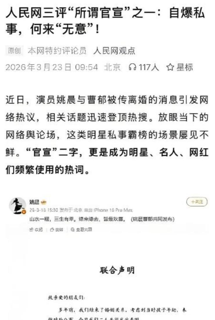 很快,人民网就发布了一条文章,直接把姚晨和曹郁当成了例子,痛批娱乐圈滥用“官宣”。