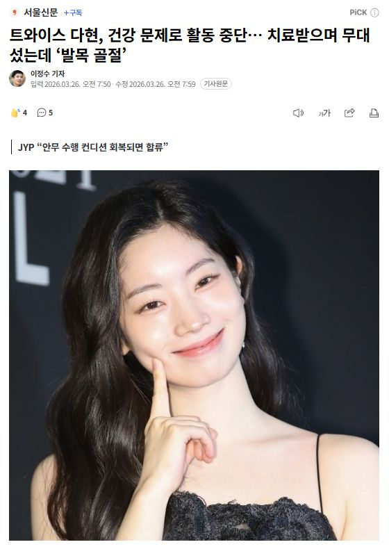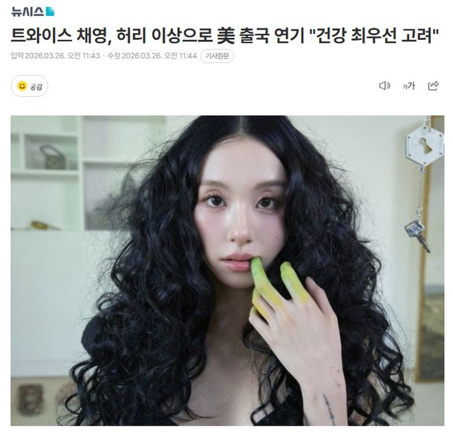 据此,彩瑛当天未与成员们一同飞往美国,而是留在国内优先接受医院诊疗及必要的治疗。公司计划在仔细确认检查结果及恢复情况后,让她尽快出境。JYP方面还表示,即使彩瑛参与演出,部分表演也可能受到限制。
