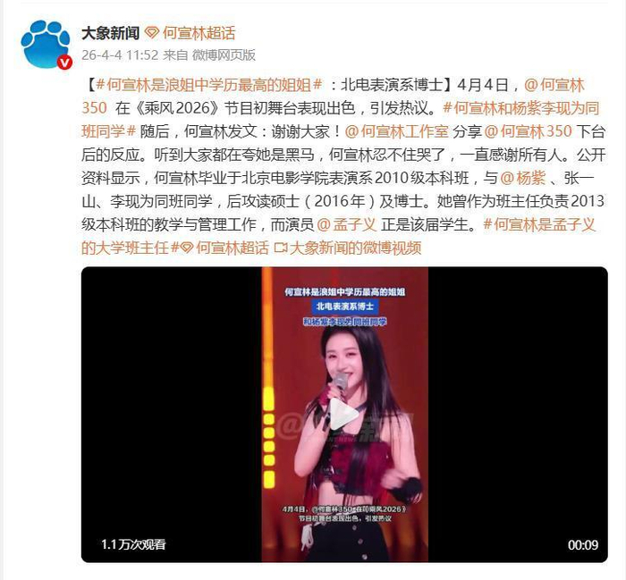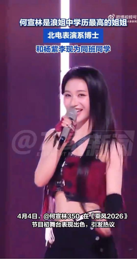 **北电表演系博士!何宣林在《乘风2026》中学历最高,和杨紫李现为同班同学,是孟子义的班主任**,4月4日,《乘风2026》(浪姐第7季)开播,引发全网关注的是一位备受瞩目的“学霸姐姐”——北京电影学院表演系博士在读的何宣林,她的登场一举两得,不仅凭借一段全开麦的稳健唱跳被观众称为“黑马”,更重要的是,她那厚重的学历让她瞬间成为节目中最耀眼的存在。,何宣林的履历堪称是内娱界的“明星之路”标杆,她于北电201级表演系本科班毕业,同班同学当中不少人已成为娱乐圈的中流砥柱,如杨紫、张一山、李现等,何宣林并未直接投身娱乐圈,而是选择了继续深造,她于2016年保送攻读硕士,顺利升读博士,并选择留校任教,将学术与表演实践相结合,作为北京电影学院表演学院2013级本科班的班主任,何宣林的教学经验和学术造诣让她在学生中享有极高的威望,她的班下不仅有后来的演员孟子义和蒋龙,其他学历拔高的选手也难免向她学习。,在《乘风2026》的舞台上,何宣林的身份格外丰富,她不仅是杨紫、李现的同班同学,更是孟子义的班主任,这种身份的多重性让她在节目中的表现充满了独特的气场,她自带着一股学院派的沉稳气质,面对节目中的各种挑战,展现出令人信服的实力,何宣林本人也坦言,节目中的表现虽然精彩,但最能体现她的成就还是她的学术背景。,节目播出后,何宣林的表现引发了热议,她的冷静和体面在观众中引起了广泛赞赏,许多网友称赞她“团队协作能力强,清醒得很”,这种沉稳的表现风格,恰好与她在学术道路上的成就相得益彰,她的博士学历不仅是个人能力的体现,更是她在娱乐圈中的一张“身份牌”,让人不得不对她的未来充满期待。,何宣林的亮相不仅仅是节目中的一股新鲜血she,更是一场关于“学历与实力”的深度互动,作为北电表演系的“学霸”,她用实力证明了学术成就与娱乐才华可以完美结合,她是否能继续用实力打破观众对“博士姐姐”的偏见,值得期待,无论是学术领域还是娱乐舞台,何宣林都在用自己的方式书写着属于她的成功篇章。,何宣林,这位北电表演系的学霸,正在用实力演绎着“学术与实践并重的新时代”。**《乘风2026》开播,北电表演系博士何宣林登场,学霸气质与“黑马”实力兼具,瞬间成为观众心中的“学霸担当”!**,4月4日,《乘风2026》(也就是《浪姐第7季》)开启了新的综艺舞台,一场看似普通的选手亮相,却直接点燃了全网热议!这位来自北电表演系的博士生何宣林,一进场就被观众们惊为“黑马”,更让人捧腹的是,她身上那个“学霸担当”的光环,瞬间让她成为了本季33位选手中学历最高的“学霸担当”者!这位“北电博士”不仅帅气,还靠着稳健的唱跳实力,瞬间收获了网友的好评,“稳稳的幸福,何宣林一跃矩”,“北电学霸来袭,直接翻了个车”。,细聊她的履历,简直就是内娱界的一张“明星班级”地图,何宣林是北电201级表演系本科班的优秀毕业生,她的同班同学当中,堪称娱乐圈中流砥柱的有杨紫、张一山、李现等等,这些人中,甚至还有后来成名的班主任孟子义,何宣林并没有选择直接扎进娱乐圈,而是继续深造,选择了北电表演系的硕士研究生道路,后来又一路读到博士,并选择留校任教,将学术与表演实践完美结合,作为北电表演学院2013级本科班的班主任,何宣林不仅教书育人,还培养了一批后来的娱乐圈新生,包括孟子义和蒋龙等人,可以说,在综艺节目里气场十足的孟子义见了何宣林,恐怕也得乖乖喊一声“何老师”。,在《乘风2026》中,何宣林的身份格外有意思,她既是杨紫、李现的同班同学,又是孟子义的班主任,作为一名在读博士和高校教师,她在节目中的表现更是让人眼前一亮,她的学院派沉稳气质,面对可能的争议,她却以团队协作的态度应对,被网友评价为“体面又清醒”,这位“学霸姐姐”的登场,不仅为节目增添了一位实力派选手,更像是投下了一颗关于“学历与实力”的讨论炸弹,当一个表演系博士站上女团竞演舞台,这本身就已经赢了话题,这位“学霸姐姐”是能继续凭实力打破偏见,还是会被“博士”光环反噬?这场“乘风破浪”的学术实践,看点才刚刚开始。,何宣林的登场,不仅让人感受到高学历带来的自信与从容,更让人忍不住为这位“北电博士”点赞,她用实力证明了学历与实力的结合,展现了真正的“学霸担当”,无论是她在舞台上的表现,还是她背后的学术经历,都让人对这位“学霸姐姐”的未来充满期待,相信在节目中,她一定能继续用实力证明自己,成为观众心中的真正赢家!