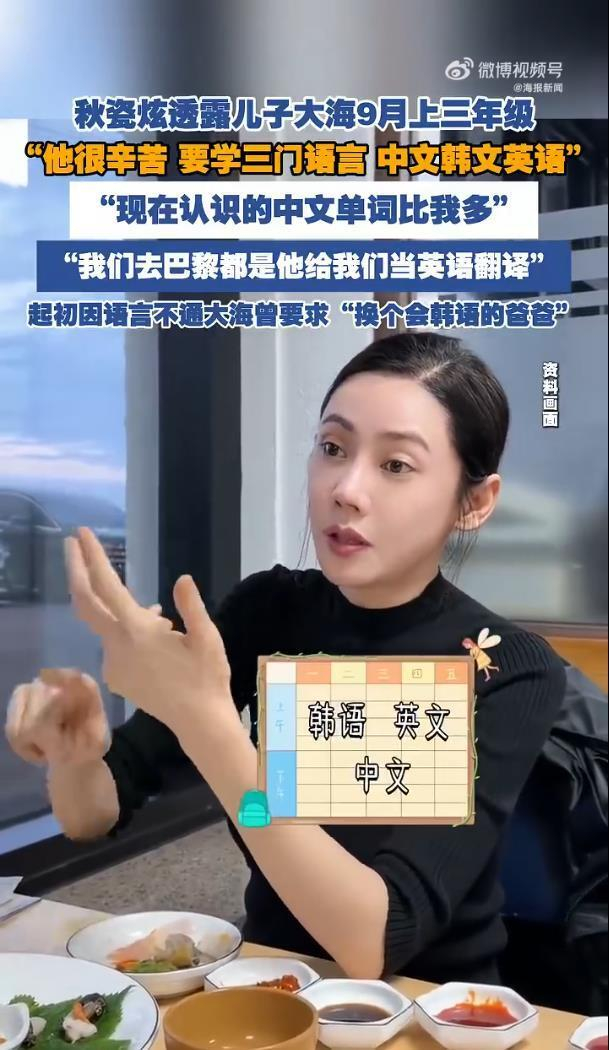 据4月7日报道,近日,韩国演员秋瓷炫一句“他很辛苦,要学三门语言”,把她那“开挂”的儿子大海送上了热搜。原来,今年9月才上三年级的7岁大海,正同时攻克中文、韩文和英文三座大山,其“战果”之辉煌,甚至已经反超了妈妈。