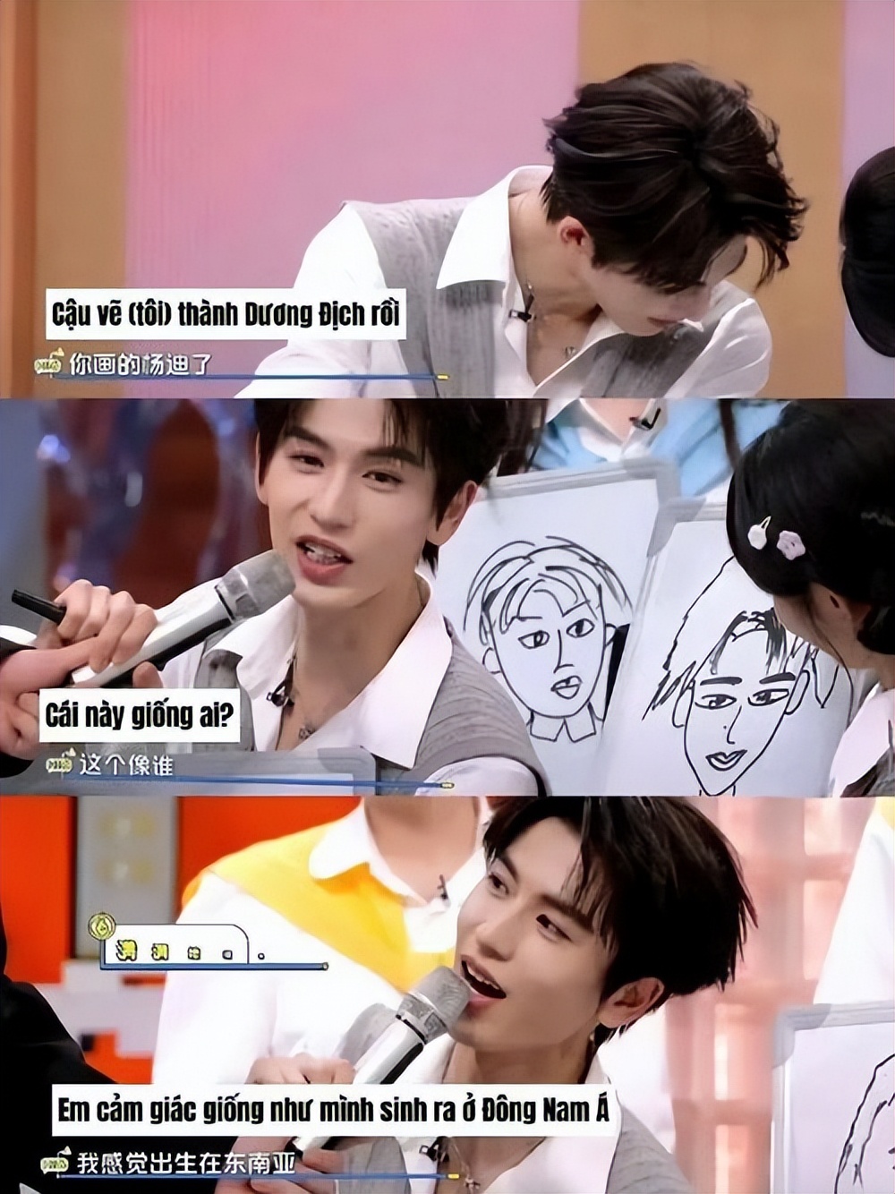游戏环节里,田曦薇画了一幅他的简笔画,他看了看,说了一句:"这像那个吹乱的头发,我感觉出生在东南亚"。