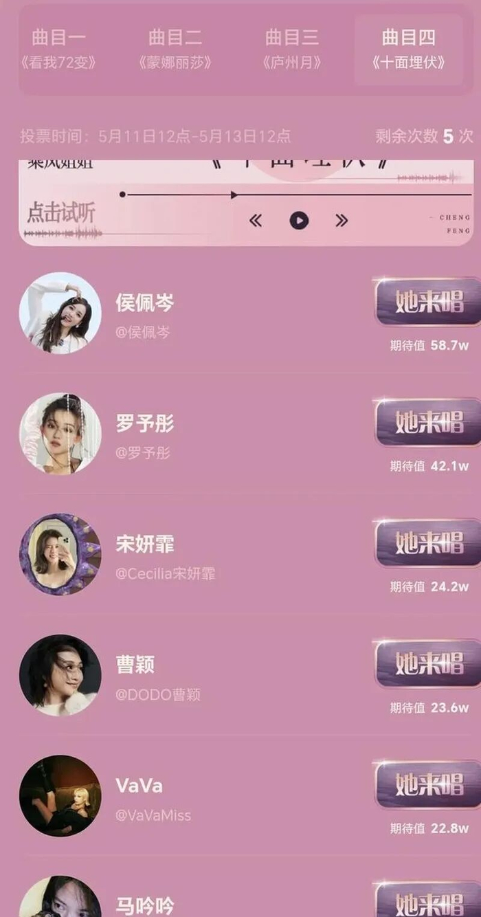 《十面埋伏》组则由带队成功率最高的侯佩岑掌舵,集结了宋妍霏、VAVA等实力派。
