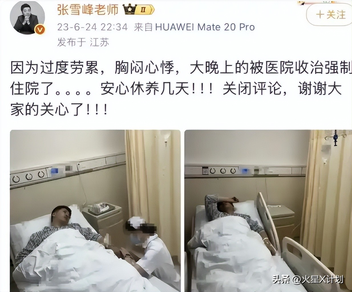 2023年6月,他因过度劳累、胸闷心悸被医院强制住院,但只休息了几天就继续工作。