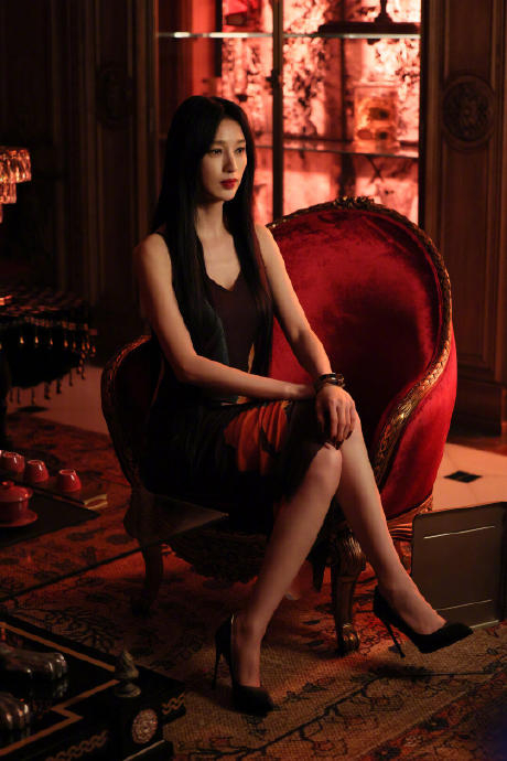 造型的隐喻性:墨绿丝绸长裙如蛇鳞流动,冷白皮搭配哑光红唇塑造“建模级蛇精脸”;盘发露出的修长脖颈与裸背镜头,将病态美与危险感可视化。