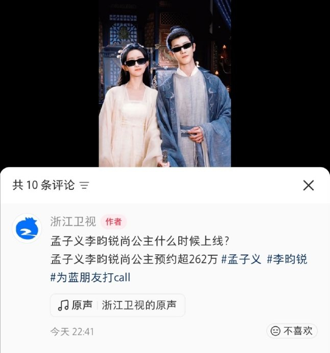 浙江卫视于2026年4月16日公布春季大剧片单,古装剧《尚公主》(主演:孟子义、李昀锐)被列入“中国蓝剧场”待播剧集,成为一线卫视重点剧作。该剧在仅有一个片花、尚未送审的情况下被浙江卫视提前锁定,被观众视为平台对主演市场号召力与剧集质感的认可。