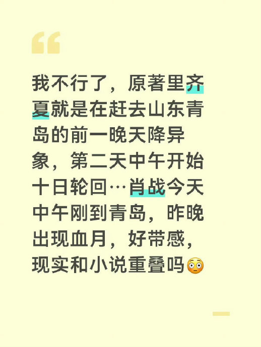 巧合的是,肖战抵青当日遭遇原著描述的“血月平流雾”异象,与齐夏被卷入终焉之地的天象设定高度重合。书粉认为这种现实与虚构的呼应,加深了演员对角色宿命感的体悟。