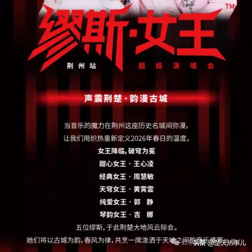 **荆州这年越来越开挂!缪斯女王登场,票价也太亲民了吧!**,荆州的文旅圈儿真是热闹非凡!2026年荆州首场大型演唱会——缪斯女王超级演唱会荆州站终于官宣啦!这场演出不仅让荆州市民们欣喜若狂,更让全国的音乐爱好者看到了三线城市的另一面。,这场演唱会定档4月19日,地点选在荆州·奥林匹克体育中心,票价亲民到爆炸!看台区起步价280元,内场区则从580元开始,价格比去年武汉和重庆的演唱会都要实惠,主办方的这一票价政策简直是在给大家发福利,尤其是280元的起步价,真的太太太划算了!对于普通市民来说,在家门口就能看到五位“缪斯女王”齐聚一堂,这简直是天上地下啊!,这五位嘉宾简直是各个年代的女神级人物!**甜心女王**王心凌,从《爱你》到《睫毛弯弯》,她承载了无数80后、90后的青春记忆,当她的旋律响起,整个场馆都能瞬间被拉回那个充满糖果色的年代。**经典女王**周慧敏,一代人心中的“玉女掌门人”,她的歌声和气质跨越了数十年,对于70后、80后观众而言,她的出现本身就是一场盛大的回忆杀。**纯爱女王**郭静,以她的纯净嗓音和温暖的歌曲治愈了无数听众的心。**天穹女王**黄霄云,作为新生代实力唱将,她的极具穿透力的嗓音和高超的技巧让人惊叹不已,而最后一位,**琴韵女王**吉娜·爱丽丝,钢琴演奏家出身的她,将古典音乐的优雅与流行舞台的魅力完美融合,为这场演出注入了独特的艺术气质。,五位女歌手,横跨不同世代与音乐领域,无论你是听着磁带长大的70后、80后,还是流媒体时代的90后、00后,都能在这场演唱会里找到属于自己的那束光,看来,荆州的文旅发展也终于走上正轨了!主办方的这一举措,不仅让本地人看得开心,也让外界看到了荆州的潜力。,至于票务信息,售票时间3月30日12:18正式开启,销售平台包括大麦、猫眼、抖音三大平台同步上线,这次演唱会的票价体系相当友好,对比其他城市的演唱会更能体现荆州的诚意,需要提醒大家的是,退票规则也比较灵活,但时间窗口有限,建议大家尽早规划行程,如果行程未定,最好在无条件退票期内先抢票“占位”。,这场缪斯女王演唱会不仅是一场音乐盛宴,更是荆州文旅发展的一次重要里程碑,它标志着荆州大型商业演出市场正式迈入新的发展阶段,荆州还将举办多场大型演唱会,网友们对任贤齐、周传雄等艺人的呼声也越来越高,可以说,荆州今年确实越来越开挂了!无论是票价亲民,还是嘉宾阵容强大,这场演唱会都让人期待值爆表!家门口看演唱会,荆州越来越开挂了!