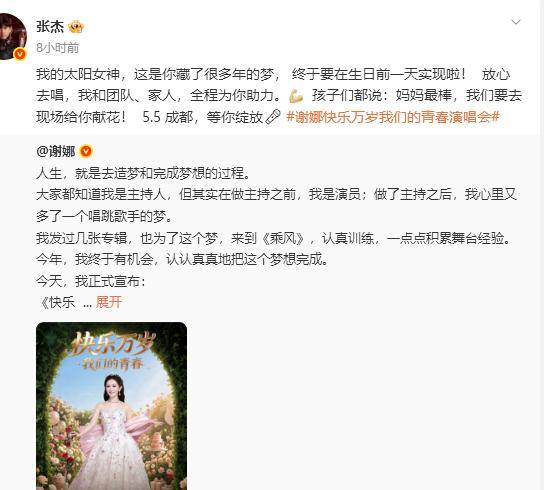4月11日,《乘风2026》一公直播现场,谢娜宣布她要开演唱会的消息,随后又在社交平台公布了日期与抢票时间。