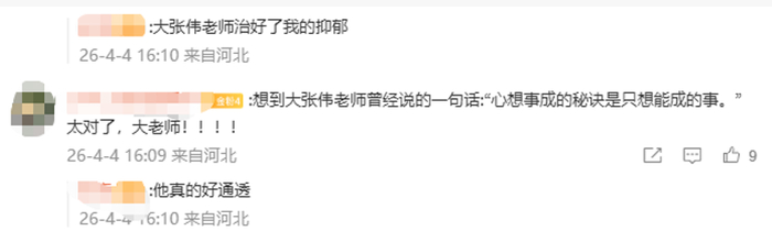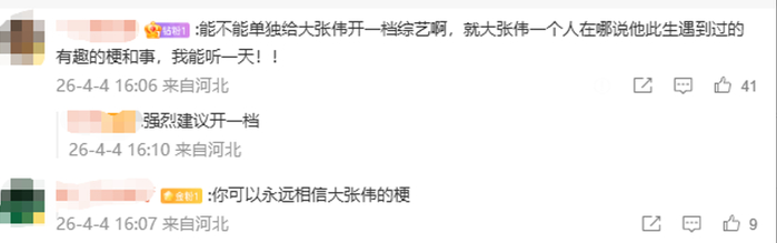 对此,网友们热情留言,有人共情“谁不想喝酒干趴岳父”,也有网友花式夸赞“你可以永远相信大张伟的梗”,更有网友喊话“求给大张伟开单独综艺,就大张伟一个人在哪说他此生遇到过的有趣的梗和事,我能听一天!”,还有人直言“大张伟老师治好了我的抑郁”。