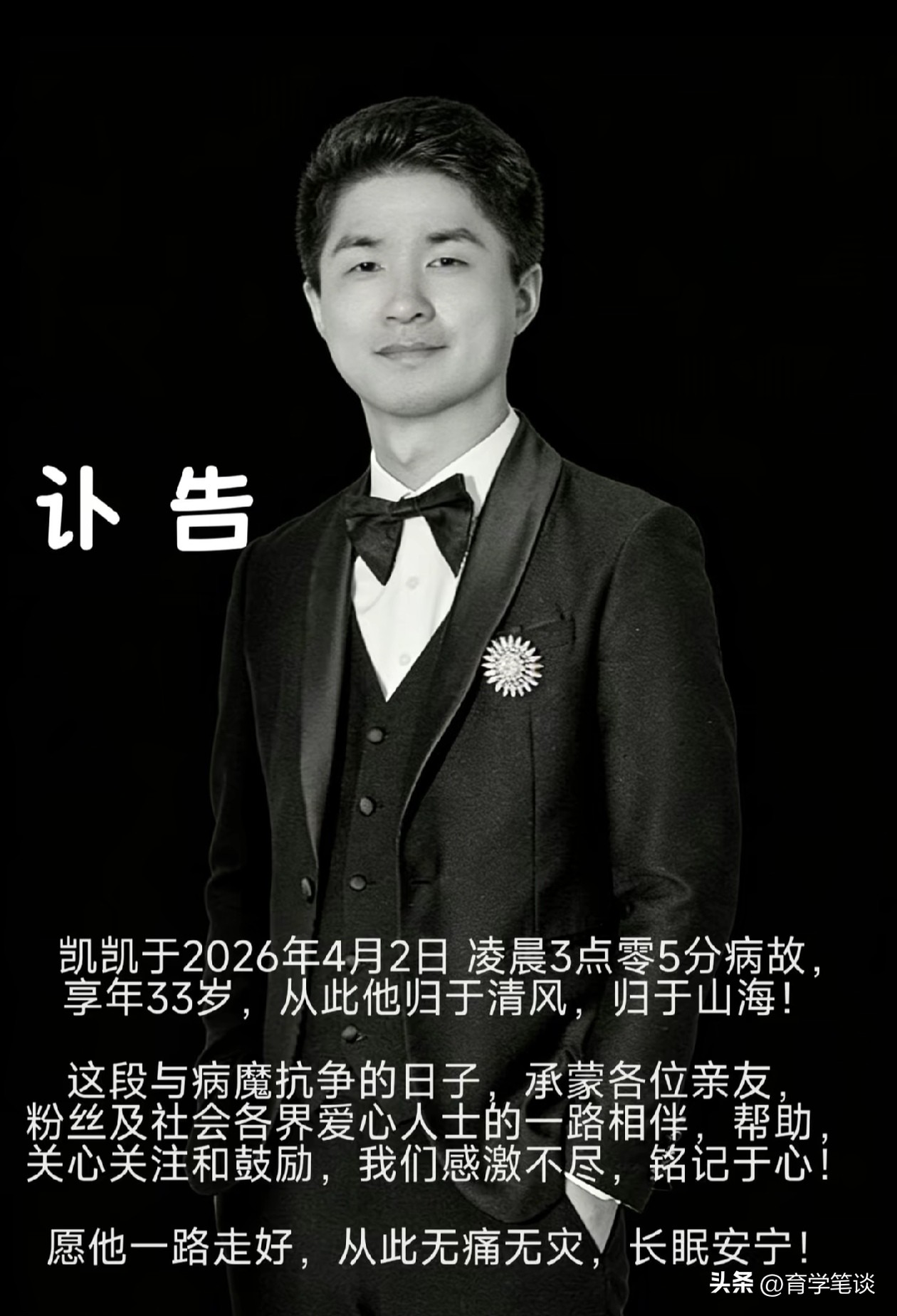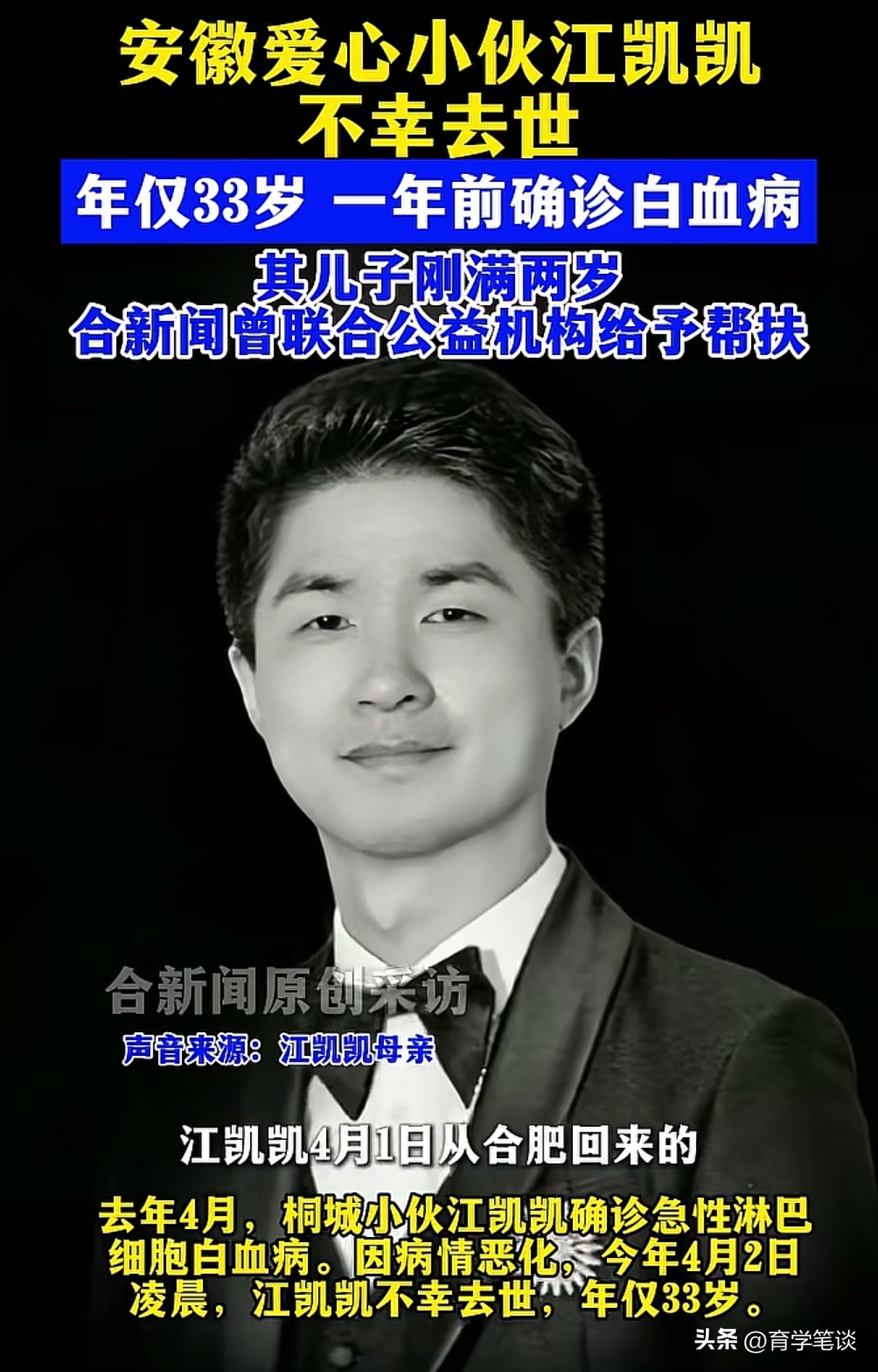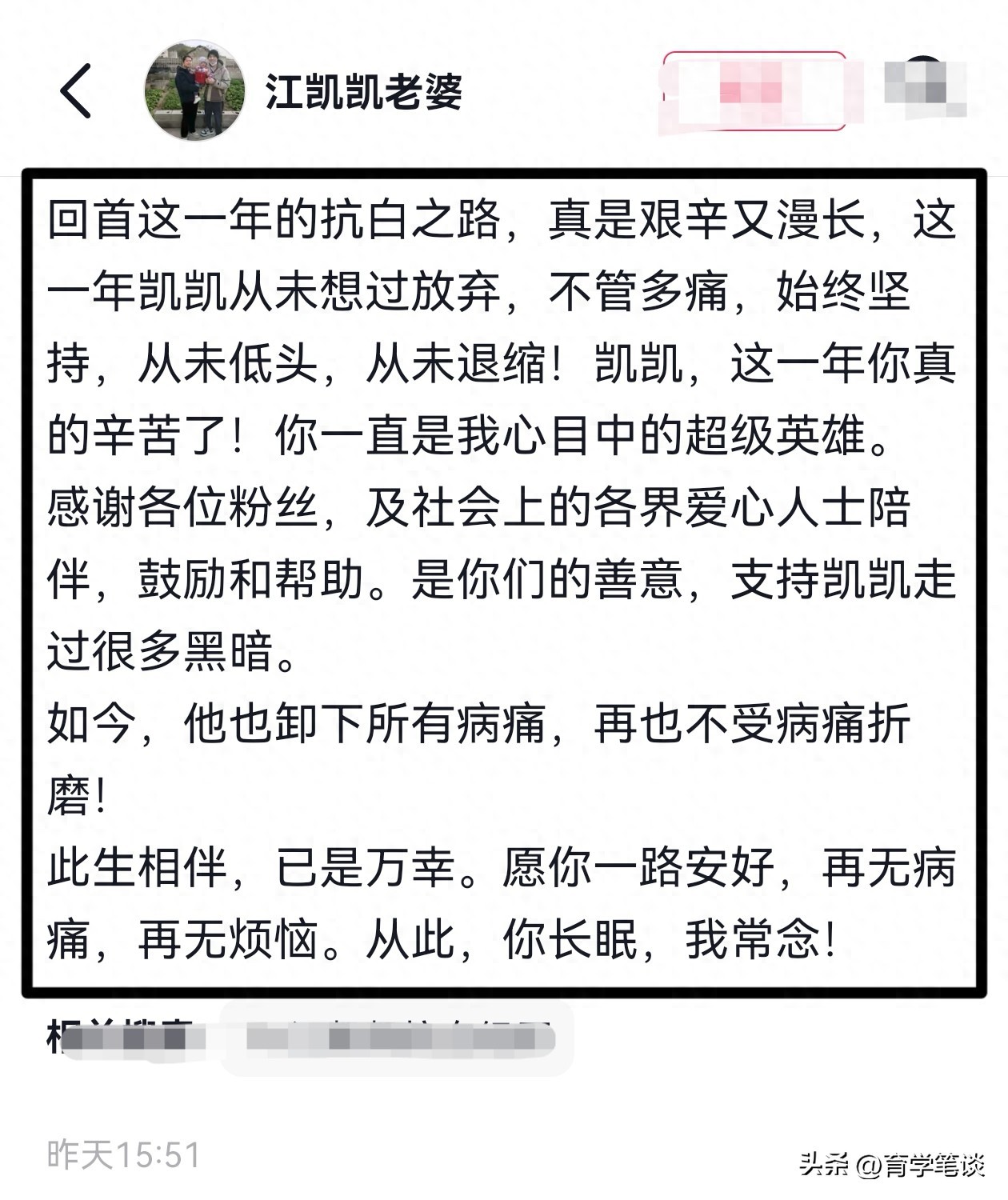 在讣告中,能看到江凯凯已于4月2日凌晨病逝,年仅33岁,妻子在讣告中向粉丝和爱心人士表达了谢意,画面凄凉,毕竟他们都还非常年轻,那个小家也才刚刚起步,活着的家人该如何面对?