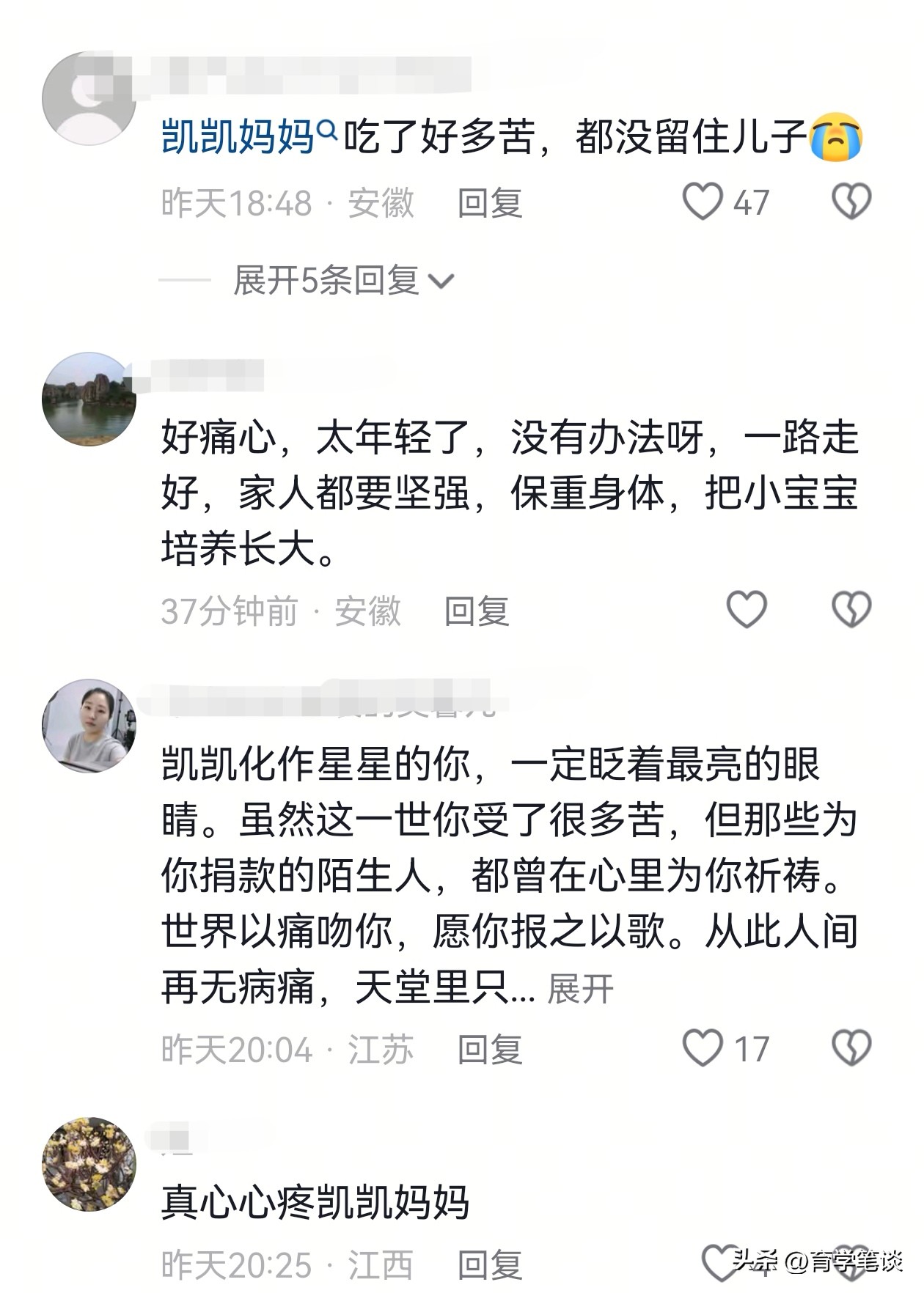 江凯凯的母亲也因此感动了很多人,获得了媒体和爱心人士的捐款,在江凯凯去世后,很多网友的第一反应是这位老人吃了很多苦,却没能留住儿子,让人心疼。