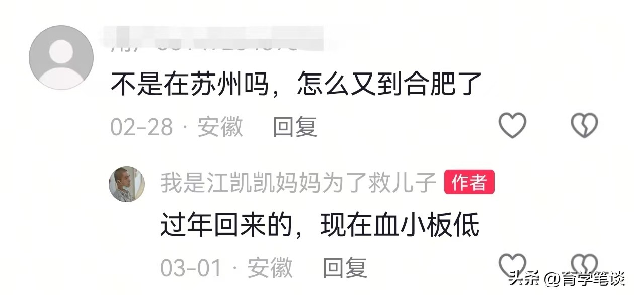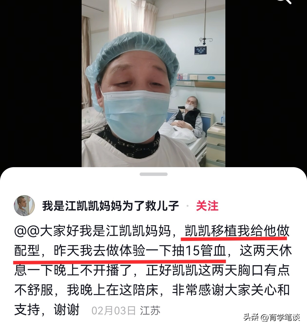后来为了给儿子安排更好的治疗,接受了网友的建议,去了苏州某医院,经过一系列的化疗,江凯凯的母亲决定要自己给儿子做配型移植,并进行了体检,抽了15管血,身体一度非常不适,晚上的直播都停了。