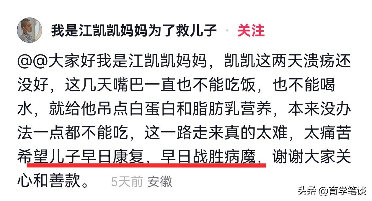 媒体和网友之所以关注这件事,是因为江凯凯在2025年4月份被查出急性淋巴细胞白血病后,其母亲为了儿子的救治到处筹钱,包括开直播、拍视频,这对于一个生在农村的老母亲来说,无疑是拼尽了全力。