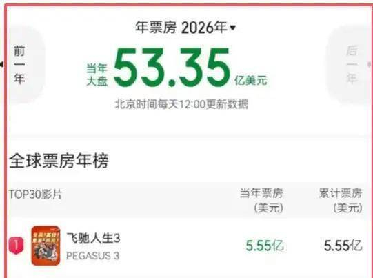 根据猫眼专业版 3 月 3 日更新的数据,《飞驰人生 3》今年的全球票房已经达到 5.55 亿美元,比《阿凡达 3》的 5.53 亿美元略高,暂时排在 2026 年全球票房榜单第一位。