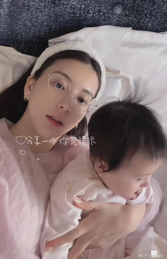 方媛抱着小女儿,躺在家里的床上,她穿着粉色的居家服,戴着白色的发箍和框架眼镜,十分休闲,毕竟在家里又要照顾孩子,还是以舒适为主。