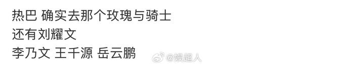 网传迪丽热巴、刘耀文新综艺《玫瑰与骑士》阵容:还有李乃文、王千源、岳云鹏。