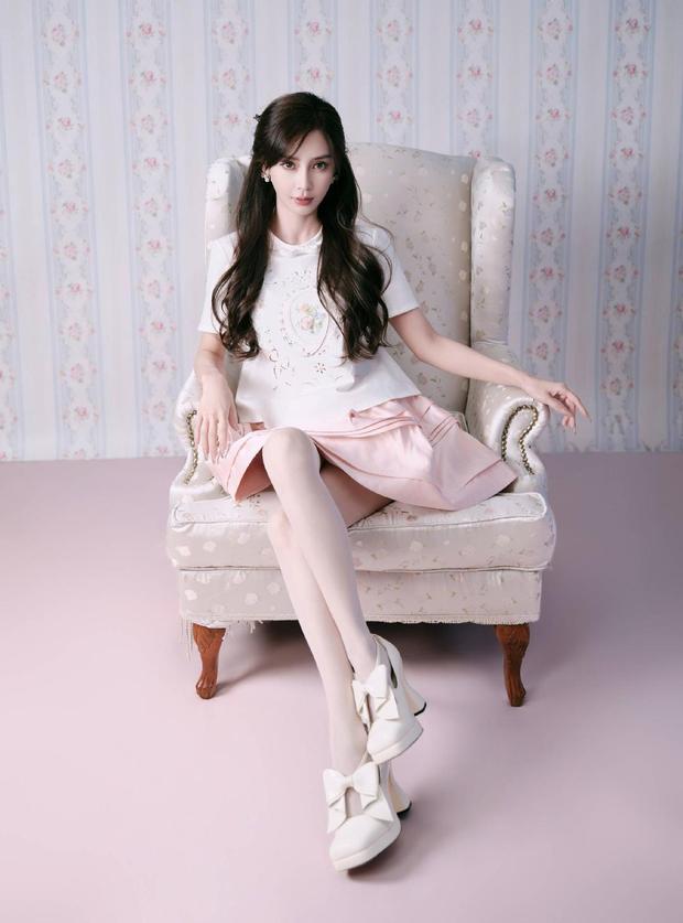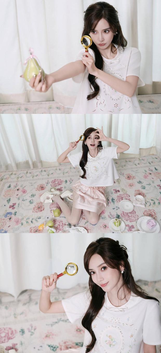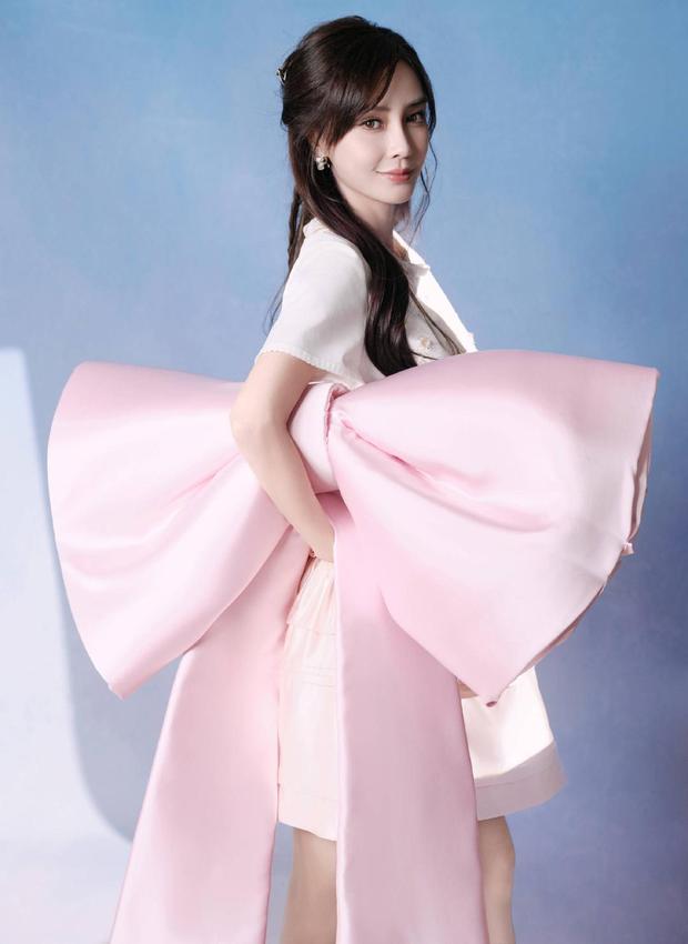 杨颖抱着超大蝴蝶结拍照,十分梦幻甜美。