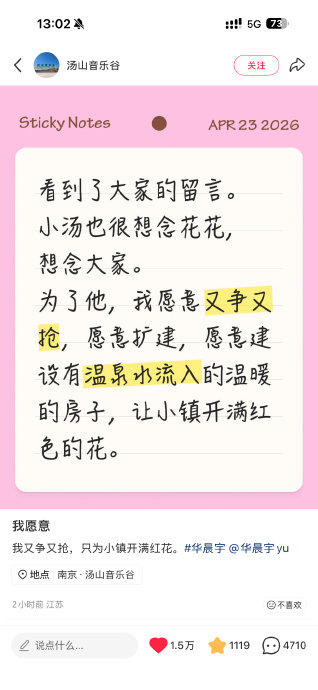 - 南京汤山音乐谷:承诺扩建场馆规模,增设温泉水循环系统打造"温暖舞台",并在小镇全域种植红色花卉呼应演唱会主题色,提出"让小镇为华晨宇开满红花"的专属方案。