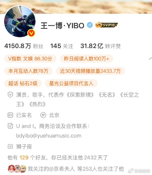 当然王一博也很挣钱,凭借不错的外形,在资源加持下,也成功入圈走红,前几年人气身价超高,为杜华和乐华娱乐赚钱不少,成为公司每年上亿收入的工程,可以说一人养活公司成全老板。