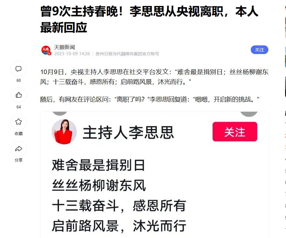 可令人百思不得其解的是,就在事业大好之际,李思思却突然宣布离开央视。