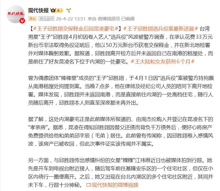 据4月22日报道,中国台湾男星“王子”邱胜翊近日卷入的“逃兵役”风波,后续发展比剧情还曲折。在承认花费33万元新台币非法取得免役证明,并以50万元新台币交保后,他的一举一动都成了媒体焦点。而最引人注目的,莫过于他离开新北地检署后的去向——并非返回自己在南港的租屋处,而是直接驱车前往了好友昆凌名下位于内湖的一处豪宅。