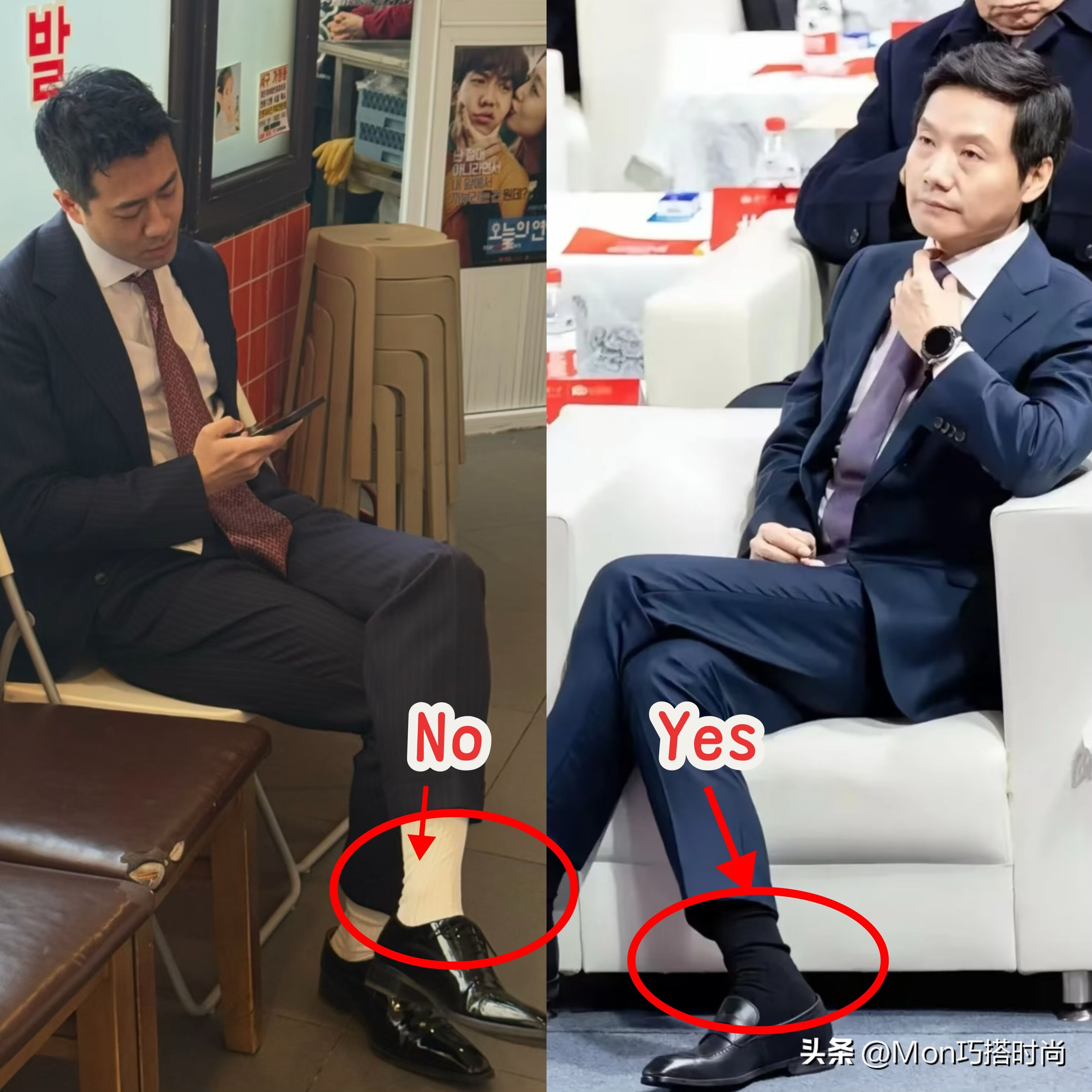 对于上年纪的男人来说,皮鞋的重要性不言而喻了吧,尤其是在一些比较重要的场合中,大部分的男性都会穿皮鞋,但皮鞋再贵,如果搭配了白袜子,就会瞬间拉低你的档次,你看下面的对比,左边这种黑色皮鞋搭配白袜子的造型看着尴尬还油腻,更严重的是袜子的颜色太突兀了,注意力都放在了袜子上。