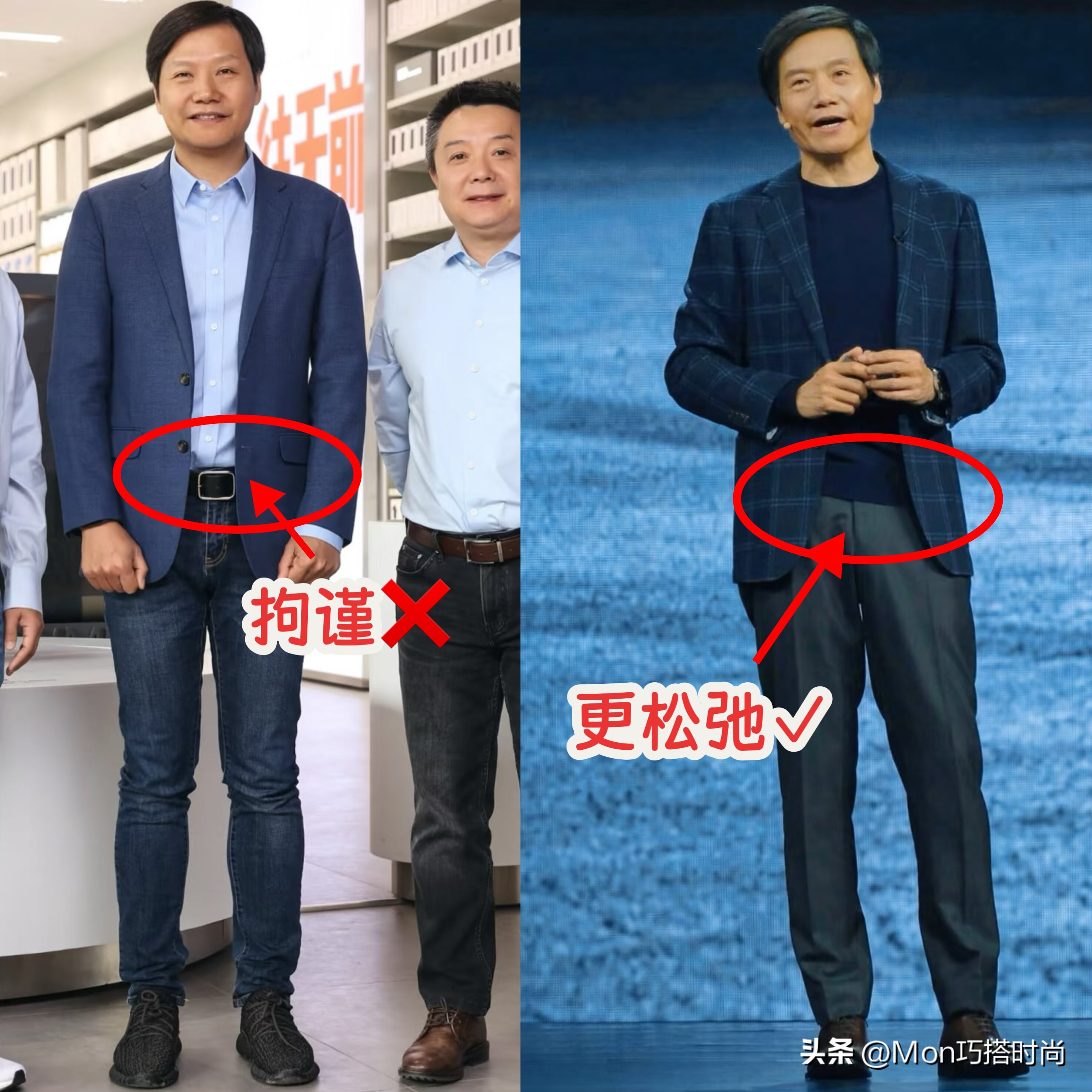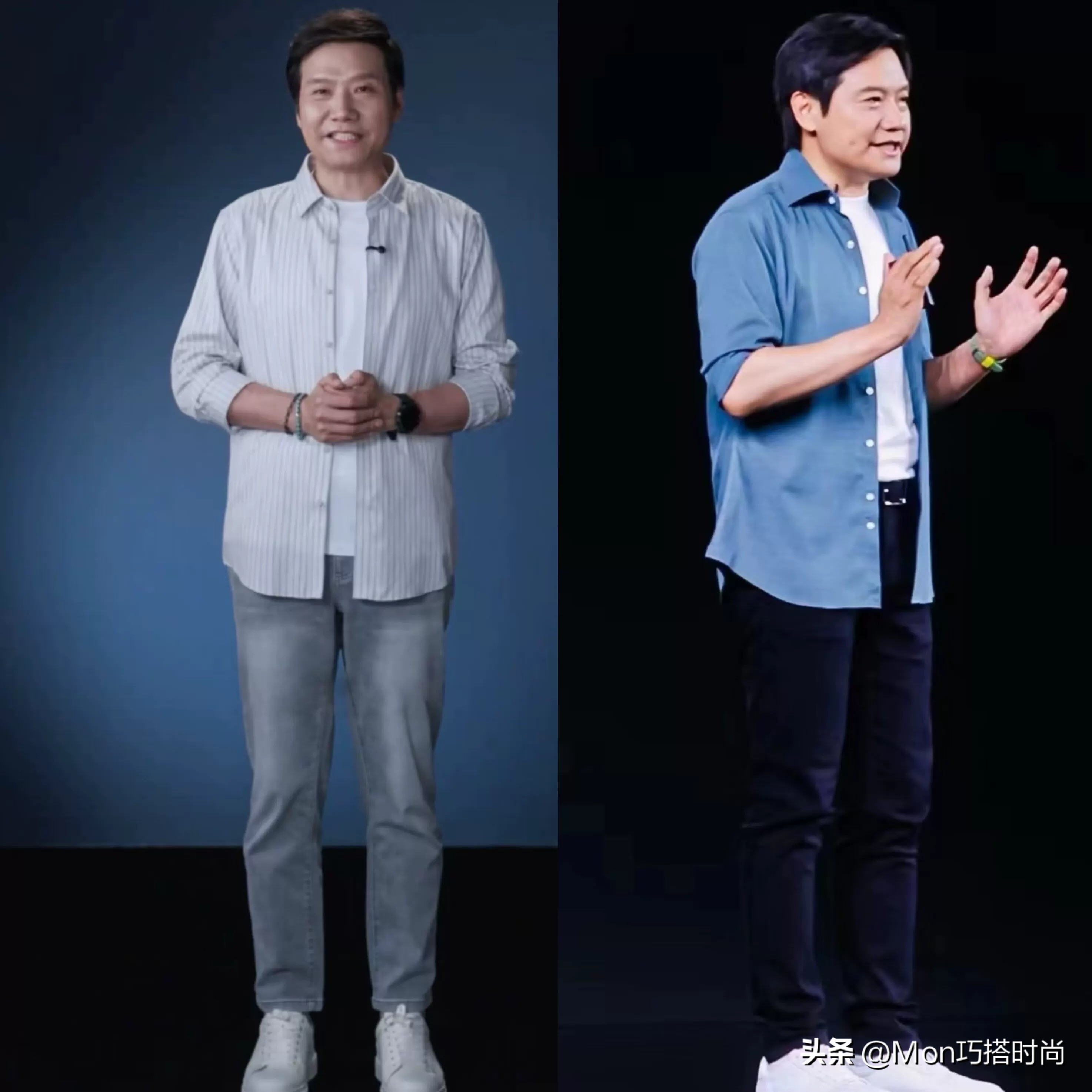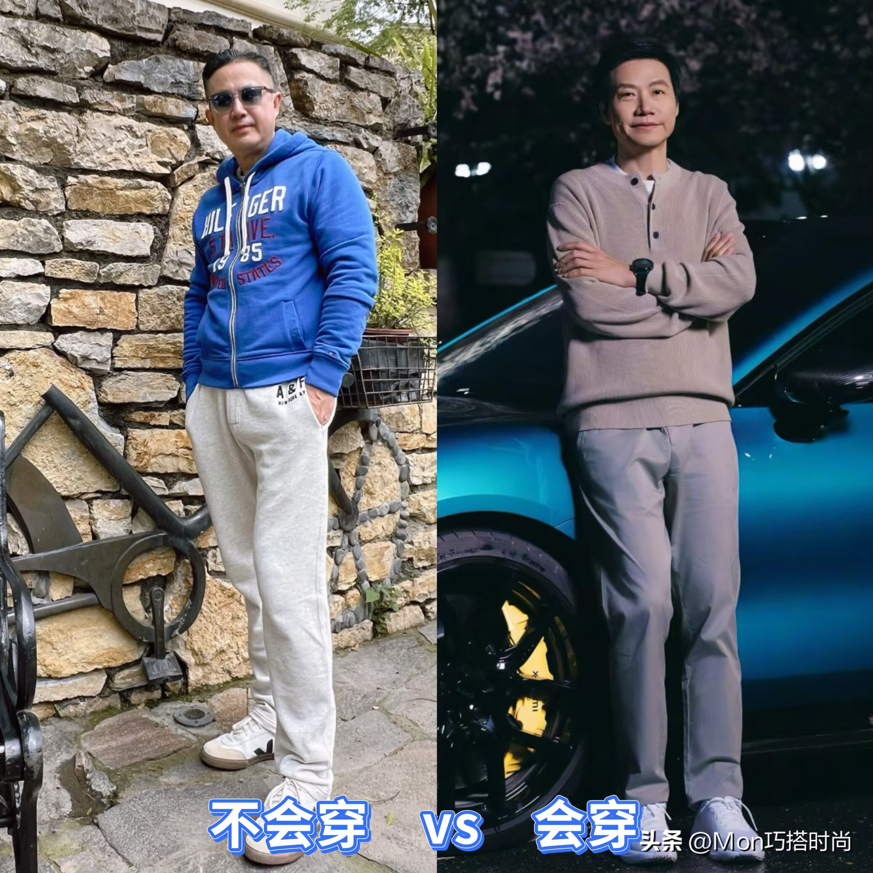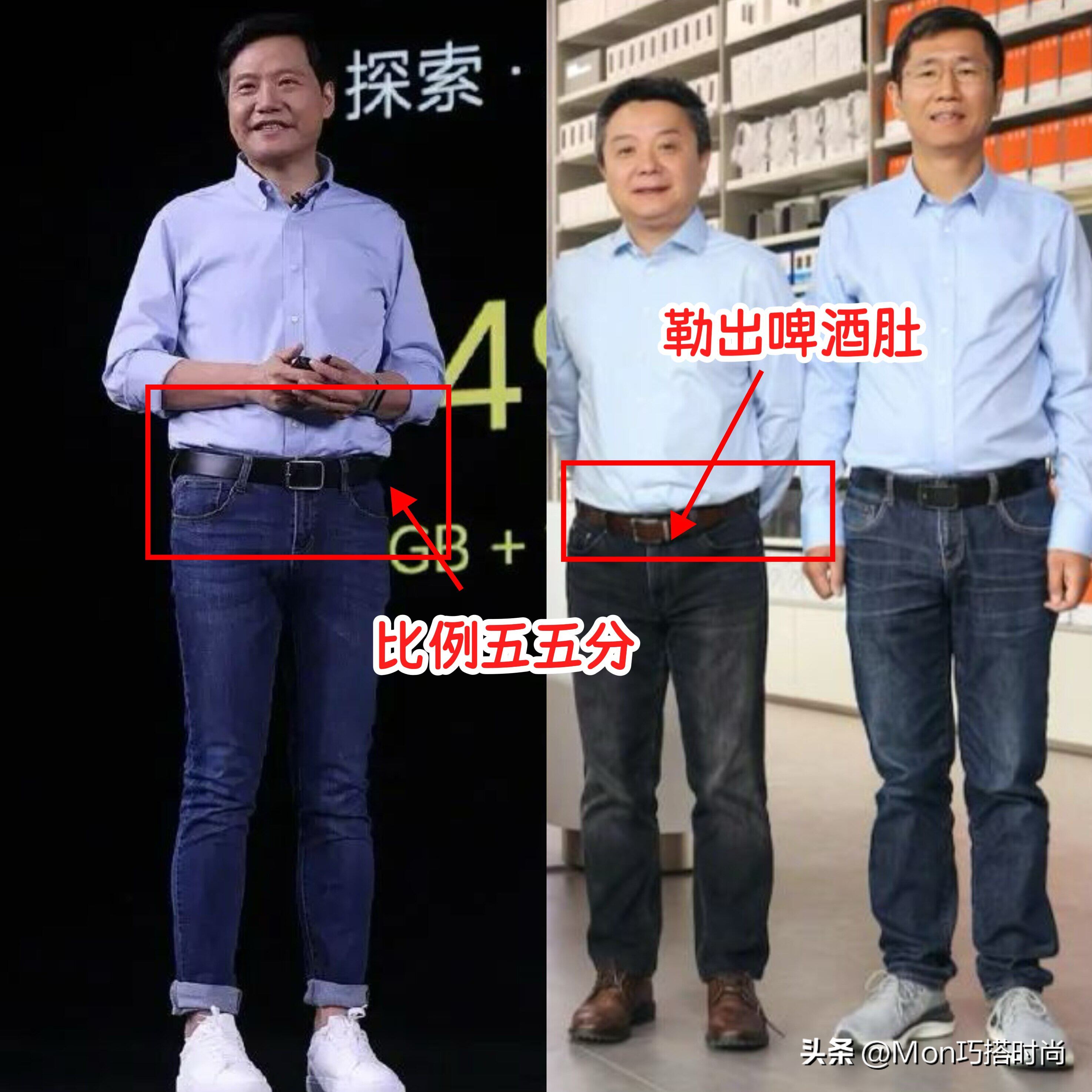 看了雷军的穿搭对比,我们也可以发现,比起塞衣角以及系皮带的穿法,他这种把衣摆自然垂下来的搭配方式会更加时髦和松弛,衣服的衣摆刚好盖住我们的啤酒肚,哪怕上年纪身材发福了也没关系,毕竟衣服一遮啥都看不出来。