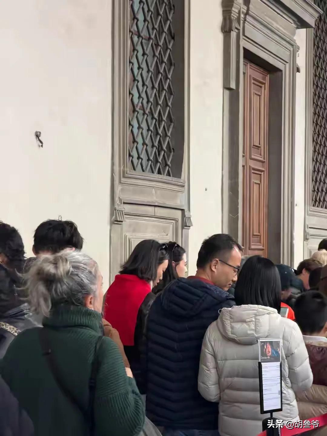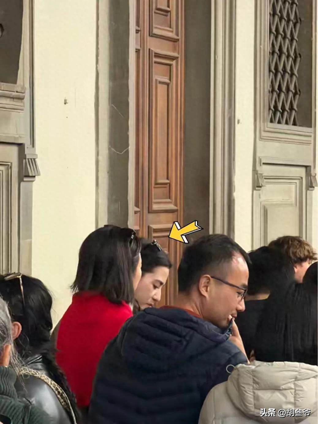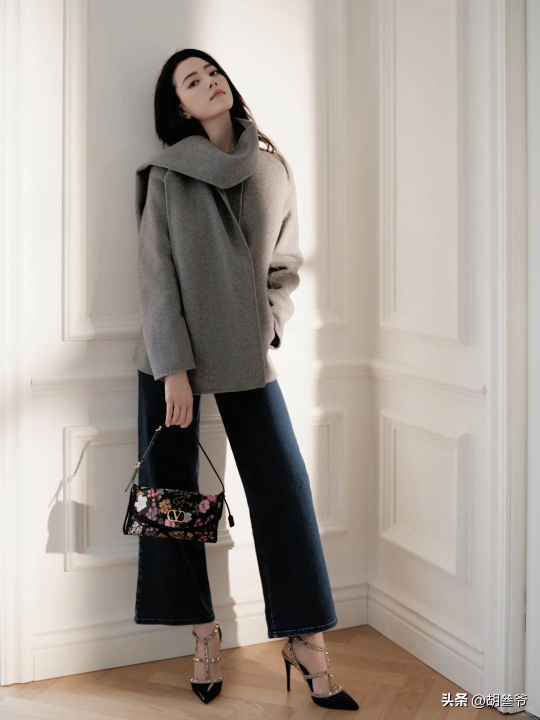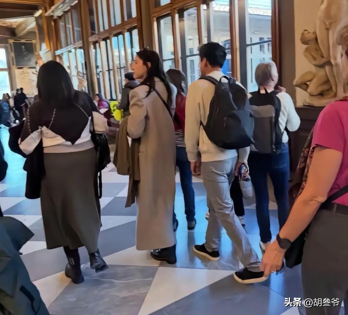 照片里她穿的浅灰色长款大衣,和春节期间网友在佛罗伦萨乌菲兹美术馆偶遇她时的穿搭一模一样。