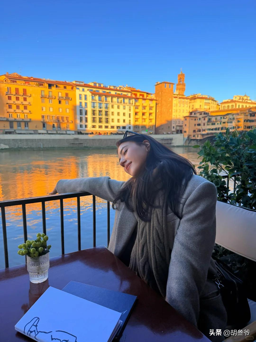 她灰色大衣搭配红色羊毛衫,单手托腮对着镜头甜笑,背景正是意大利佛罗伦萨街头。