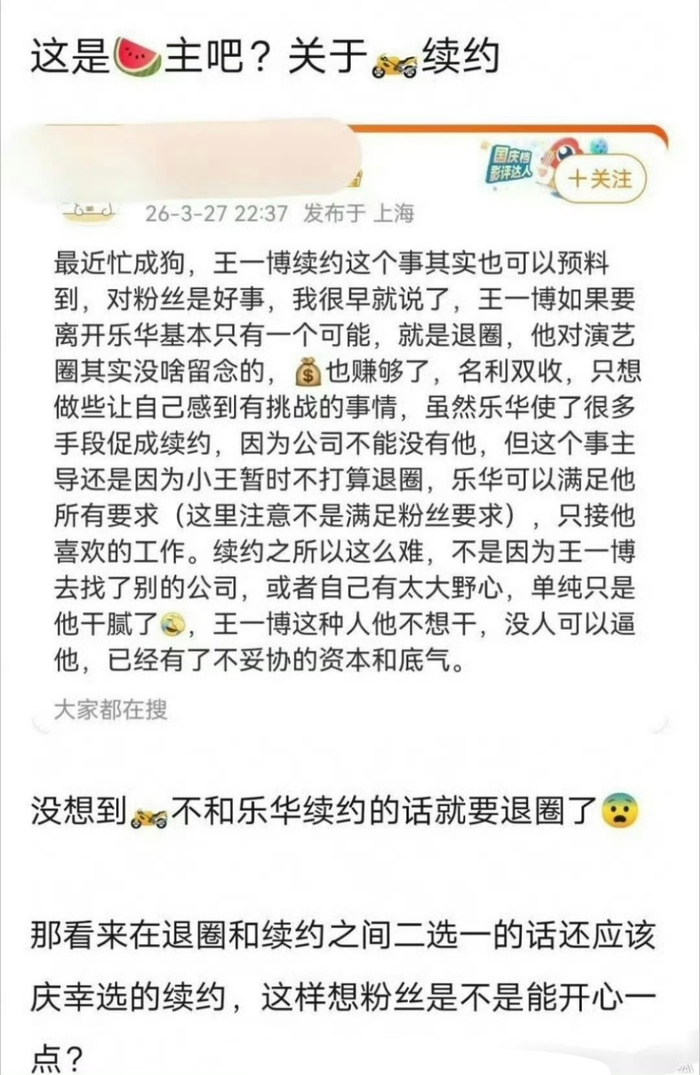 ## 王一博续约乐华,退圈传闻不打烊:吃瓜者,快看热闹吧!,关于王一博和乐华的续约传闻又掀起了一波热议,有人说王一博这种状态和乐华续约也挺好,要不然迟早会退圈……这话听着多有意思,简直像是在说:“这明星靠什么运气才到现在?连续几年都是‘大神’,就是靠着经纪公司的点赞券吗?”这哪是吃瓜,简直是吃烤串了。,说到王一博,这可不是一个普通的“小鲜肉”啊,从出道开始,他就用努力工作和敬业精神,给观众留下了深刻的印象,现在的王一博,不仅在演技上有了质的飞跃,个人品牌也在不断升级,从时尚到生活,他都能玩转得风生水起,再加上最近的热度爆发,堪称“全能爆款”,这哪是偶然,分明是天赋加上点点心血啊!,再来看乐华,作为国内顶级经纪公司,续约王一博绝对不是随便就决定的事情,乐华不是随便签约一个小鲜肉,而是经过精心考量的,王一博在公司里的表现,包括市场表现和口碑,都达到了顶级水准,自然续约就是最明智的选择,乐华续约王一博,意味着对他的未来发展充满信心,这也说明王一博在公司内部的地位和价值。,至于退圈传闻,这已经变成了吃瓜界的经典梗,每隔一段时间就会有“明星即将退圈”这种消息传出,结果却始终没有真正发生,退圈传闻就像是明星生涯的“保命票”,让吃瓜群众永远有看热闹的理由,王一博这种顶流状态,根本不是靠“退圈”来炒作的,他的状态和发展,都在朝着更大的高度稳步前进。,吃瓜者们,放心吧!王一博和乐华的续约,意味着他们都在稳扎稳打,王一博的状态和商业价值,完全不需要靠“退圈”来证明,他的未来发展,肯定会更加精彩,至于那些“退圈”传闻,还是老一套的吃瓜梗,继续看,继续嗑,反正热闹不少啊!