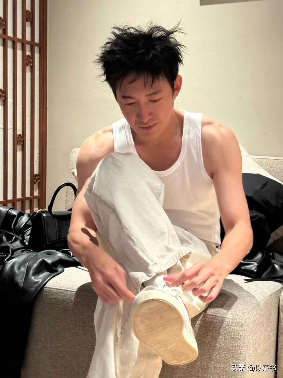 要不是有人眼尖认出来,估计没人会把这个排队等孩子的中年男人,跟荧幕上那个气场十足的“叔圈天菜”联系到一起。