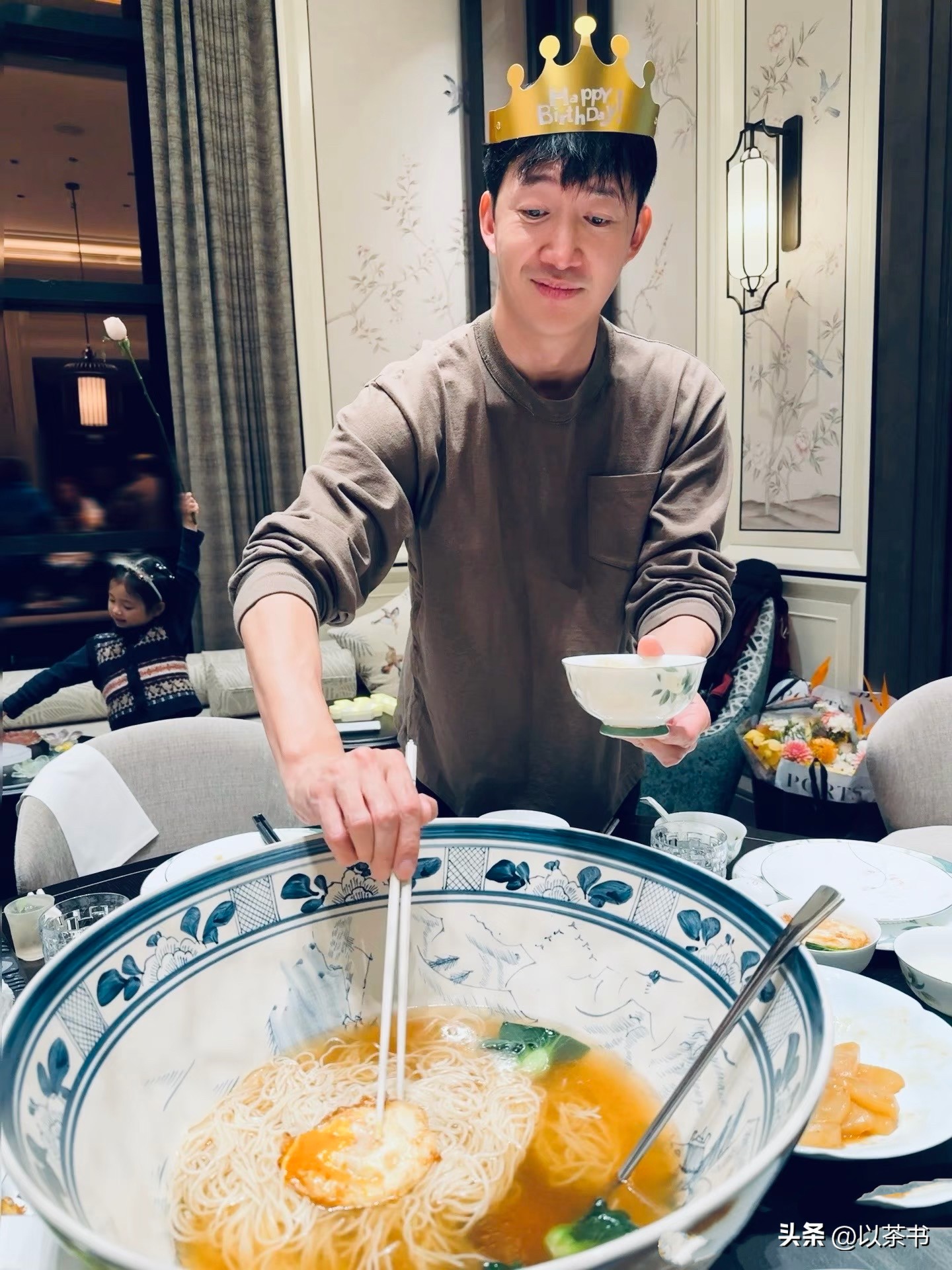 王阳48岁生日的时候,高斯给他煮了一碗长寿面,一家三口围坐在一起拍了张照片。