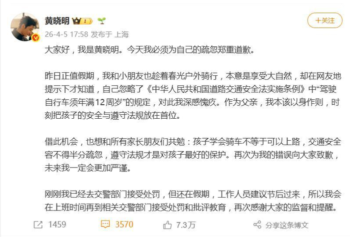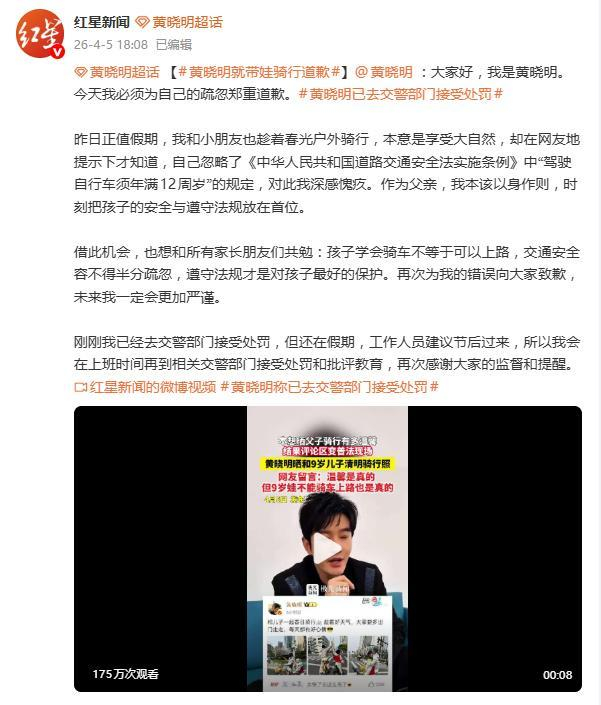 这波“网友在线执法”效果立竿见影。4月5日,黄晓明迅速删除了原博文,并发布了一篇态度诚恳的致歉声明。他坦承自己忽略了法规,对此“深感愧疚”,并明确公布了后续处理:已主动前往交警部门,因正值假期被建议节后再去接受具体的批评教育和处罚。他在道歉文中特别强调了一句被众多家长转发的话:“孩子学会骑车不等于可以上路,交通安全容不得半分疏忽。”同时,他也反省自己作为父亲未能以身作则,承诺未来会更严谨。