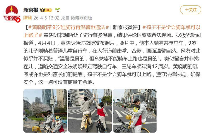 4月4日,黄晓明在微博晒出与儿子小海绵的春日骑行合照。画面里,父子俩身穿亲子装,在上海街头骑着共享单车和儿童自行车温馨击掌,本是一幅“岁月静好”的亲子时光图。然而,评论区很快“画风突变”,有网友直接搬出《中华人民共和国道路交通安全法实施条例》第七十二条,指出“驾驶自行车、三轮车必须年满12周岁”,并提醒照片中两人均未佩戴头盔,存在明确的安全隐患。