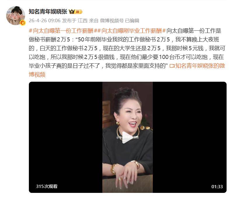 据网友4月26日爆料,向太陈岚在直播中的一番爆料,内容相当炸裂——她自曝自己50年前刚毕业时的第一份工作,月薪就高达2万5港元。这个数字一出,不少网友的第一反应是:50年前的2万5,那得是什么概念?