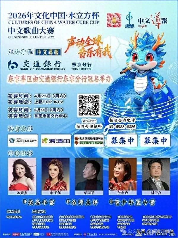 **“水立方杯”中文歌曲大赛东京赛区参赛者风采:多元才华,文化交融** ,2026年“文化中国·水立方杯”中文歌曲大赛在东京赛区也掀起了热潮!本次大赛以“声动全球,音乐有我”为主题,开设了海外赛区少年组、青年组、港澳赛区少年组以及北京赛区青年组四个组别,赛程分为选拔赛、晋级赛、决赛三个阶段,东京赛区的中文导报社面向华侨华人和日本友人招募热爱唱歌的朋友,通过比赛展示才华、交流文化、结交朋友的绝佳机会。 ,此次比赛不仅吸引了不少华侨华人报名,还有不少日本朋友表示想来一展歌喉,从报名信息来看,参赛者风貌各异,涵盖了不同年龄层的音乐爱好者和才艺展示者,他们中不乏一些在音乐、舞蹈、摄影等领域有独特造诣的选手,令人期待他们在赛场上的表现。 ,### **少年组与儿童组:年轻才子与才女的舞台初露** ,在东京赛区的少年组和儿童组中,参赛者们年纪虽小,但才华却不容小觑,以“深见一然”和“深见一卓”为代表的选手们,分别以街舞、拉丁舞为爱好,展现了年轻一代对音乐与舞蹈的热爱,胡智尧和邹雅菲这样的活泼可爱的小朋友,凭借朗诵、舞蹈和音乐的才华,给人一种充满活力的感觉,他们不仅喜欢唱歌跳舞,还热衷于学习多种艺术形式,未来无疑会有更好的表现。 ,### **青年组与成人组:多元风采,才华横溢** ,青年组和成人组的参赛者则展现了更多元的风采,田艾其作为一名31岁的留学生,虽然以贝斯和尤克里里为特长,但她的摄影和舞蹈也让人印象深刻,她曾在中美两地长大,融合了东西方的文化元素,展现出独特的艺术表达,南宫晓玲则是一位从小热爱音乐创作的艺术家,她不仅自编自导电影并获奖,还考入了纽约大学导演系,后来转向医疗AI与计算机领域深造,她以三语创作音乐并组织演出,展现了文化与艺术的完美融合。 ,值得一提的是,成人组的参赛者还包括“阿卡贝拉团”的成员,由赵一凡发起的阿卡贝拉团通过社交媒体招募成员,展现了新一代年轻人利用网络平台表达自我的能力,团里的成员们各有特色,像孙诗彤不仅是阿卡贝拉的主唱,还爱好唱歌和料理;王雨孜是女高,擅长绘画;赵一凡是女中,喜欢花艺;袁昊是男高,爱好网上冲浪;YAN XIAOGUANG则是男低,热爱爵士乐;人声打击的庄彦斌则专注于音乐创作,他们的团队合作和个人才华让人期待他们在比赛中的精彩表现。 ,### **文化交流,音乐同心** ,这次比赛不仅是展示个人才华的舞台,也是文化交流的好机会,无论是来自世界各地的华侨华人,还是对中文文化感兴趣的日本朋友,都是比赛的重要参与者,比赛组织方还特别邀请了北京的音乐夏令营,鼓励年轻选手到北京接受专业训练,这无疑为他们的音乐之路开辟了新方向。 ,### **机会难得,报名参与还未错过** ,已经有不少选手报名参赛,但还有一些热爱音乐的朋友还未给主办方提交相片,比赛团队呼吁还未报名的朋友尽快行动起来,抓住这个难得的机会,展现自己的才华,无论是年轻的小艺术家,还是音乐领域的资深者,都能找到属于自己的舞台。 ,这次“水立方杯”中文歌曲大赛东京赛区的参赛者风采,展现了中华文化的多样性和年轻一代的活力与创意,无论是音乐、舞蹈、电影还是科技领域,参赛者们都在用自己的方式诠释着“音乐有我”的主题,让我们一起期待他们在赛场上的精彩表现,共同见证中华文化的魅力与力量!**吃瓜简评:东京赛区“水立方杯”歌唱比赛,才华横溢,笑声不断!**,东京赛区的中文导报社举办了“2026年‘文化中国·水立方杯’中文歌曲大赛”启动仪式,现场气氛热烈,众多热爱音乐的华侨华人和日本友人纷纷踊跃报名参赛,这个大赛以“声动全球,音乐有我”为主题,开设了海外赛区少年组、青年组、港澳赛区少年组以及北京赛区青年组四大赛区,赛程分为选拔赛、晋级赛、决赛三个阶段,旨在为全球华人华侨展示才华,传播中文音乐文化。,在众多参赛者中,每个人都有独特的风采和才华,留学生田艾其不仅擅长贝斯和尤克里里,还喜欢摄影和舞蹈,活力四射;南宫晓玲则是从小热爱音乐创作,曾自编自导电影获奖,并考入纽约大学导演系,后转向医疗AI与计算机领域深造,但依然热衷于音乐创作和组织演出,展现出多才多艺的天赋。,儿童组的参赛者更是让人忍俊不禁,胡智尧和邹雅菲两个活泼的小天使不仅喜欢朗诵、舞蹈和音乐,还总是开朗爱笑,充满了青春的活力,特别是当他们在舞台上跳着热情的舞蹈,手舞足蹈、笑声不断,更是让人感受到纯真的快乐。,更有趣的是,成人组的孙诗彤(也称孙菲菲)和她的阿卡贝拉团成员,通过社交媒体招募成员,一年级成立,团成员构铃满声,他们的阿卡贝拉表演风格独特,既有才华又有趣,吸引了不少粉丝,尤其是团里的女高王雨孜、女中赵一凡、男高袁昊、男低YAN XIAOGUANG和人声打击庄彦斌,每个人都有自己独特的才艺表现,整个团的默契配合令人惊叹。,仙台的学者何鹤之也加入了大赛,他的音乐才华和学术背景让人倍感风雅,还有胡蓝心这个小小的舞者,她不仅喜欢唱歌跳舞,还擅长手工制作,多才多艺的她让人感叹:这孩子是多么可爱呢!,这次“水立方杯”歌唱比赛的东京赛区不仅是一个展现才华的舞台,更是一个充满欢乐和热情的音乐之旅,无论是青少年的活力,还是成年人的沉淀,大家都在用自己的方式诠释着“音乐有我”的主题,机会难得,报名参与还没错过哦!快扫码报名,和这些