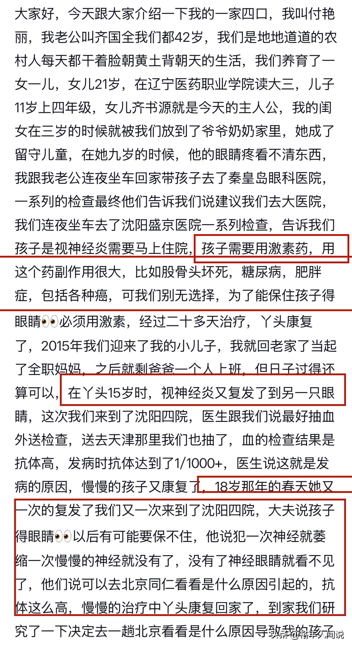 早在去年的时候,齐书源的妈妈就曾分享女儿小时候的经历。因为视神经炎,她曾在九岁的时候住院,虽说康复,但这中间使用了激素药,而这个药的副作用就包括她之后的“结果”。