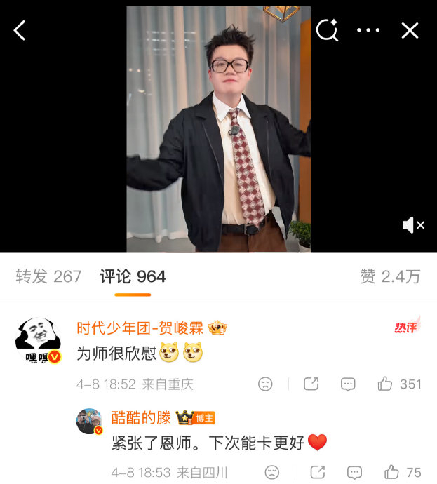 2026年4月8日,酷酷的滕发布首支手势舞视频,公开致谢“感谢恩师小贺”,并鸣谢节目组灯光师、摄影师等成员。视频中,此前因“不ning不ning”舞被调侃肢体不协调的他,动作流畅卡点、表情管理在线,进步显著引发热议。贺峻霖迅速在评论区回应“为师很欣慰”,酷滕则谦逊回复“紧张了恩师,下次能卡更好”,师徒对话金句点燃全网二创热情。
