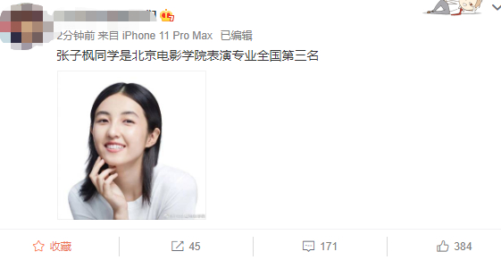 7月23日,北京电影学院艺术类专业成绩已公布,有网友爆料称张子枫是北京电影学院表演专业全国第三名,成功通过专业考试。