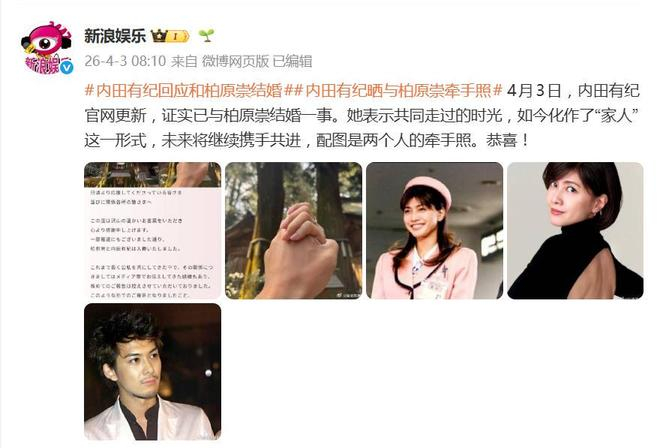 4月3日,日本演员内田有纪的一则官网更新,在平静的娱乐圈投下了一颗“甜蜜炸弹”。没有盛大仪式,没有记者会,只有一篇简短的声明和一张两人的牵手照,便证实了她与柏原崇已完成结婚登记。这波“极致低调”的操作,让网友在送上祝福的同时,也不禁感叹:“这保密工作,做得也太好了!”