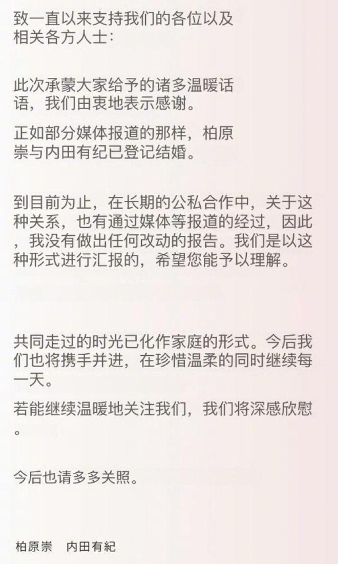 这则婚讯的曝光方式,堪称“被动式官宣”。除了官网声明,另一关键证据是公司登记信息——内田有纪的社员名称已悄然变更为“柏原有纪”。当媒体向双方事务所求证时,得到的仅是“私人事务不予置评”的标准回复。据悉,多数工作伙伴也并未提前知情,婚讯完全以非公开形式处理。