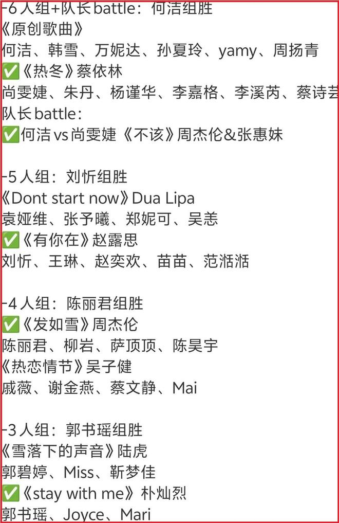 最终,跨界参赛的陈丽君率队拿到全场最高分,何洁组、刘忻组和郭书瑶组分列第二三四名,后四名成绩未公布,遭遇一轮游的是李溪芮和miss韩懿莹。